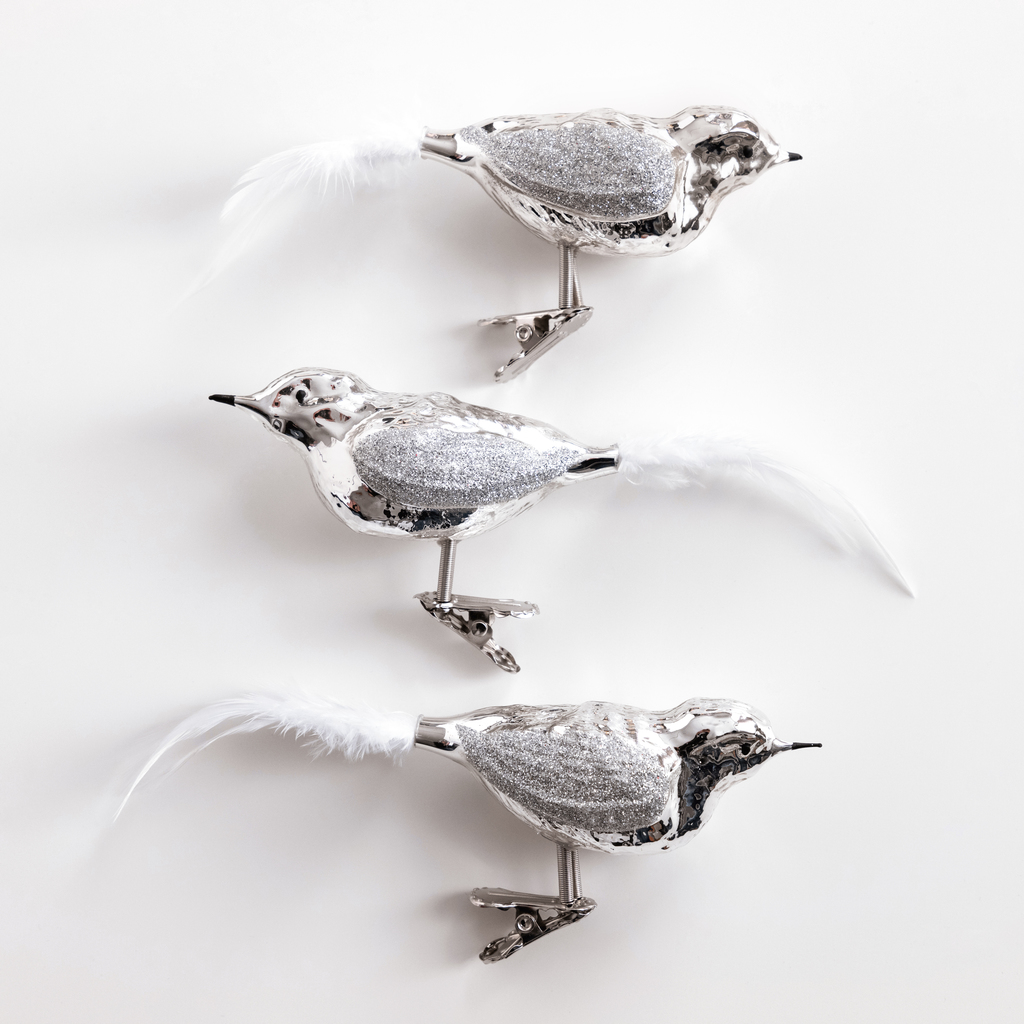Baumschmuck in Form kleiner Vögel, die zunächst in eine Porzellanform geblasen und dann gefärbt werden. Die Flügel werden separat mit Eislack aufgemalt, der danach mit Glimmer verziert wird und ihnen einen irisierenden Glanz verleiht. Die Vögel stehen auf Beinen aus Metallfedern und sind mit Schwanzfedern aus Hühnerfedern verziert.