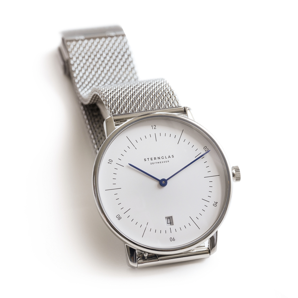 Sternglas: Zeitmesser Bauhaus Weißes Ziffernblatt mit Milanaiseband