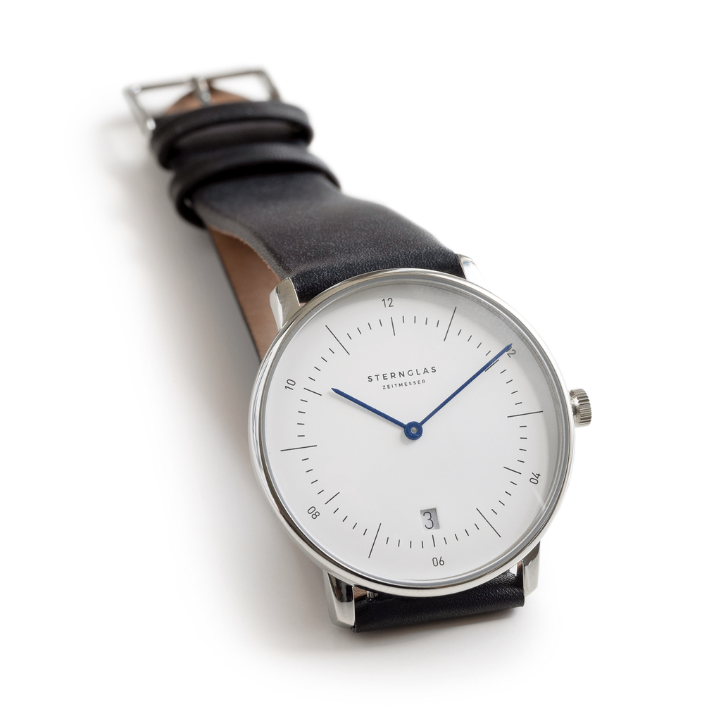 Sternglas: Zeitmesser Bauhaus Weißes Ziffernblatt mit schwarzem Band