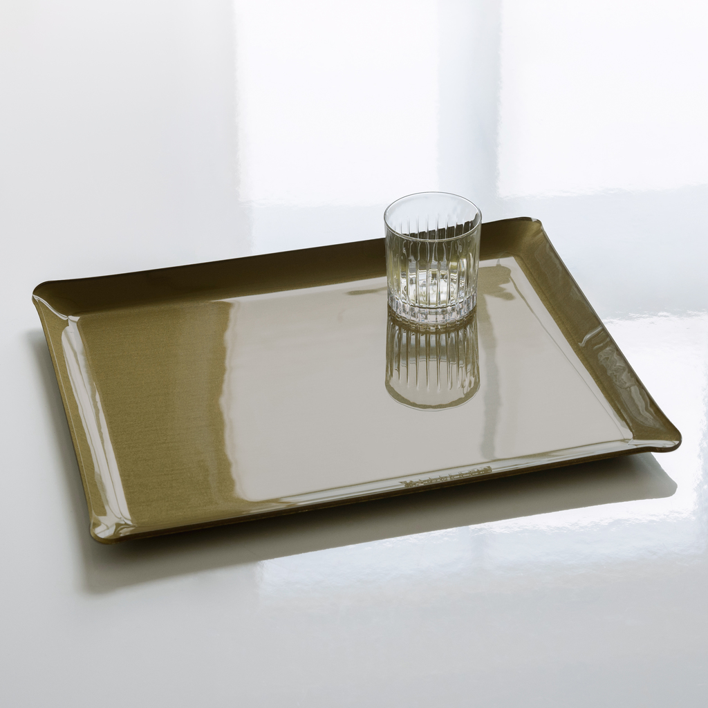 Doppellagiges Acryltablett mit einer eingearbeiteten Stoffschicht. Durch die mit 4 mm sehr starke obere Acrylschicht entsteht ein besonders tiefer Farbglanz. Um Gewicht zu sparen, ist die untere Schicht lediglich 1 mm dick. Umlaufend aufgebogene Ränder, vier kleine Silikonfüße. Zur Reinigung einfach feucht abwischen, nicht spülmaschinengeeignet. Aus Frankreich.