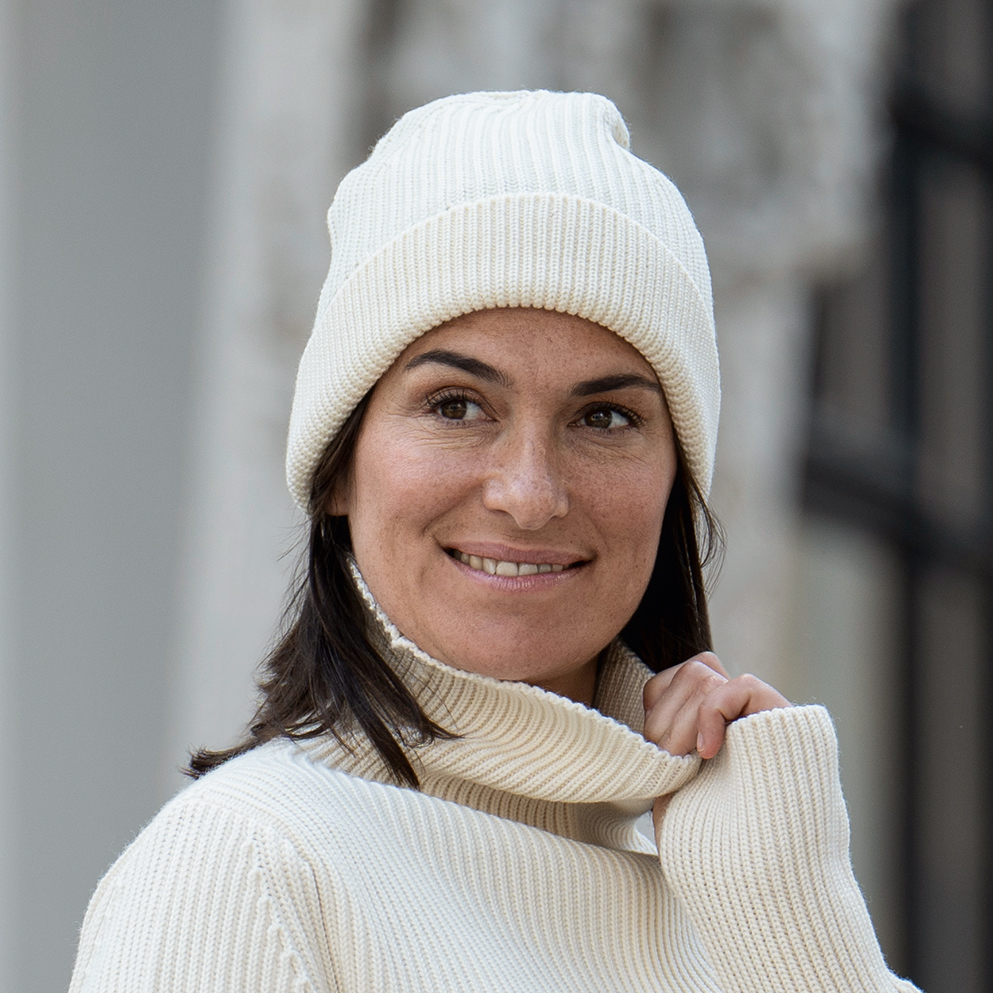 Aus dickem Rippenstrick gefertigte Wollmütze aus reiner Wolle. Das hier verwendete Strickverfahren nennt sich Full-Cardigan: eine spezielle Rippenstrick-Variante mit breiten Zwischenräumen zwischen den einzelnen Rippen, die eine besonders dicke und damit auch besonders formstabile und wärmende, zugleich aber sehr flexible Strickqualität ermöglicht. Reine Wolle aus Patagonien, versponnen und verstrickt in Italien. Einheitsgröße, Höhe ohne Umschlag ca. 26 cm. Für die blaue Variante werden die Wollfasern noch vor dem Verspinnen mit pflanzlichem Indigo gefärbt.