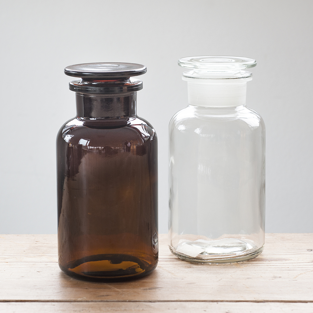 Eine puristische Lösung für die Vorratshaltung in Küche und Speisekammer sind diese Flaschen die in dieser Form seit über 100 Jahren zur Verwendung in Apotheken oder Labors hergestellt werden. Sie sind aus dickwandigem, robustem Glas gefertigt. Verschlossen werden sie mit exakt eingeschliffenen Glasstopfen, die für annähernd luftdichten Verschluß sorgen. Lieferbar sind die Flaschen in weißem oder braunem Glas, wobei braunes Glas den Vorzug hat, daß es die Vorräte zusätzlich vor Lichteinwirkung schützt.