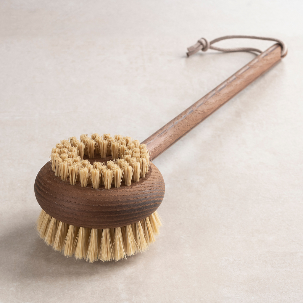 Mit Naturborsten bestückte Badebürste aus Holz mit langem Griff und doppelseitigem Bürstenkopf. Die beiden Seiten des Bürstenkopfs sind mit Borsten unterschiedlicher Härte ausgestattet, um an empfindlicheren Stellen nicht zu kratzen. Die Bürste kann vor Dusche oder Bad trocken als Massage- und Peelingbürste verwendet werden, um abgestorbene Hautpartikel zu entfernen. Griff und Bürstenkopf bestehen aus thermisch behandeltem und dadurch wasser- und fäulnisresistentem Eschenholz. Aus Frankreich.