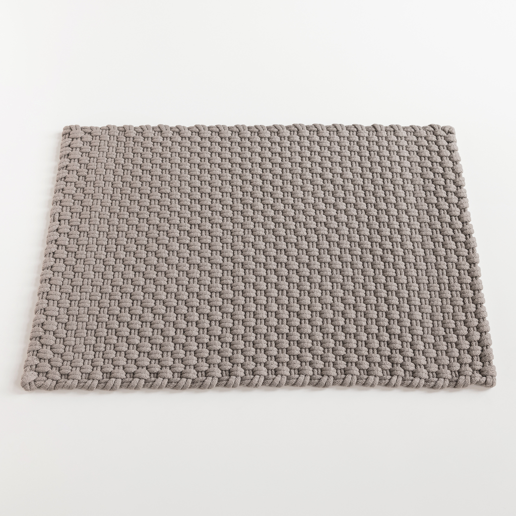 Handgewebte grau und weiß gemusterte Matte für die Verwendung im Badezimmer, aber auch im Freien. Als Grundmaterial dienen recycelte PET-Flaschen, die zu feinen Flocken vermahlen und dann z. B. zu den hier verwendeten textilen Polypropylenfasern weiterverarbeitet werden, aus denen schließlich textiles Garn gesponnen wird. Der Nachhaltigkeitsvorteil wiederverwerteter Kunststoffe liegt darin begründet, dass auf vorhandenes Material zurückgegriffen werden kann, anstatt erst in petrochemischen Verfahren neuen Kunststoff aus Erdöl gewinnen zu müssen. Angenehmer Nebeneffekt des Materials ist, dass es schmutzabweisend, wasserabweisend, schimmelhemmend, UV-beständig und gut zu reinigen ist und sich dazu noch sehr angenehm anfühlt.