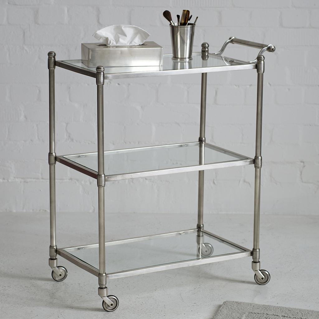 Badezimmerwagen aus versilbertem Messing. Mit Griff, 3 Glasböden und klassischen, schmalen Laufrollen mit Gummilauf.