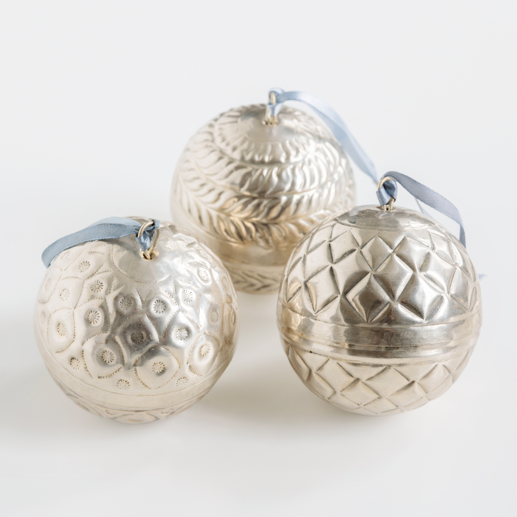 In Handarbeit aus reinem Messing getriebene Kugeln mit drei unterschiedlichen Prägedekors. Mit polierter oder antik versilberter Oberfläche reflektieren sie im Christbaum wunderschön das Kerzenlicht. Mit Satinbändchen zum Aufhängen.