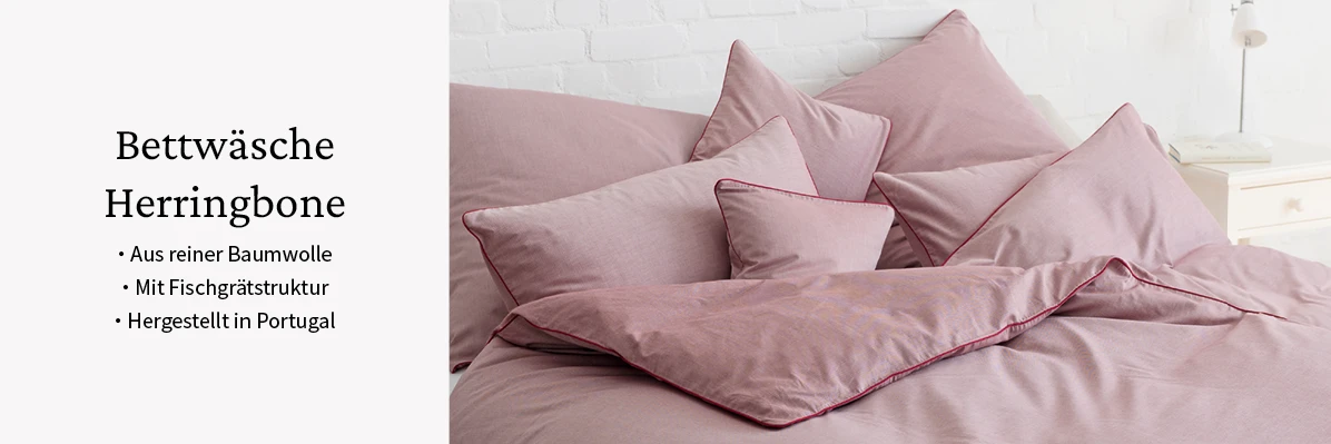 Fischgrätmuster und Bettwäsche sind ein eher seltenes Duo. Wir finden: -absolut zu Unrecht. Denn die spezielle Webart sorgt nicht nur für einen changierenden Glanz, sondern ist auch besonders strapazierfähig und -knittert wenig. Ausreichend Gründe also, um mit unserem portugiesischen Bettwäsche-lieferanten eine kleine Serie in dieser speziellen Webart und in der üblichen hohen Qualität zu entwickeln. Die Kissen verfügen über eine allseitig umlaufende Paspel; die Decken haben eine verdeckte Knopfleiste und eine dreiseitig umlaufende Paspel.
