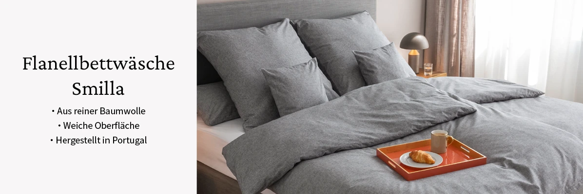 Bettwäsche aus Baumwollflanell fühlt sich mit ihrer weichen, angerauten Oberfläche herrlich warm an – angenehmer geht es kaum, wenn es draußen kalt und ungemütlich wird. Durch das Aufrauen wärmt das Gewebe nicht nur besser, sondern kann auch mehr Feuchtigkeit aufnehmen und gleicht die Temperatur besser aus. Der Flanell für unsere Bettwäsche wird aus feinem, weichem Baumwollgarn zu einem besonders dichten Gewebe verarbeitet, das angenehm leicht und anschmiegsam ist. Seine lebendige grau melierte Oberfläche erhält das Material durch das Verweben von schwarzen sowie weißen Kett- und Schussfäden.