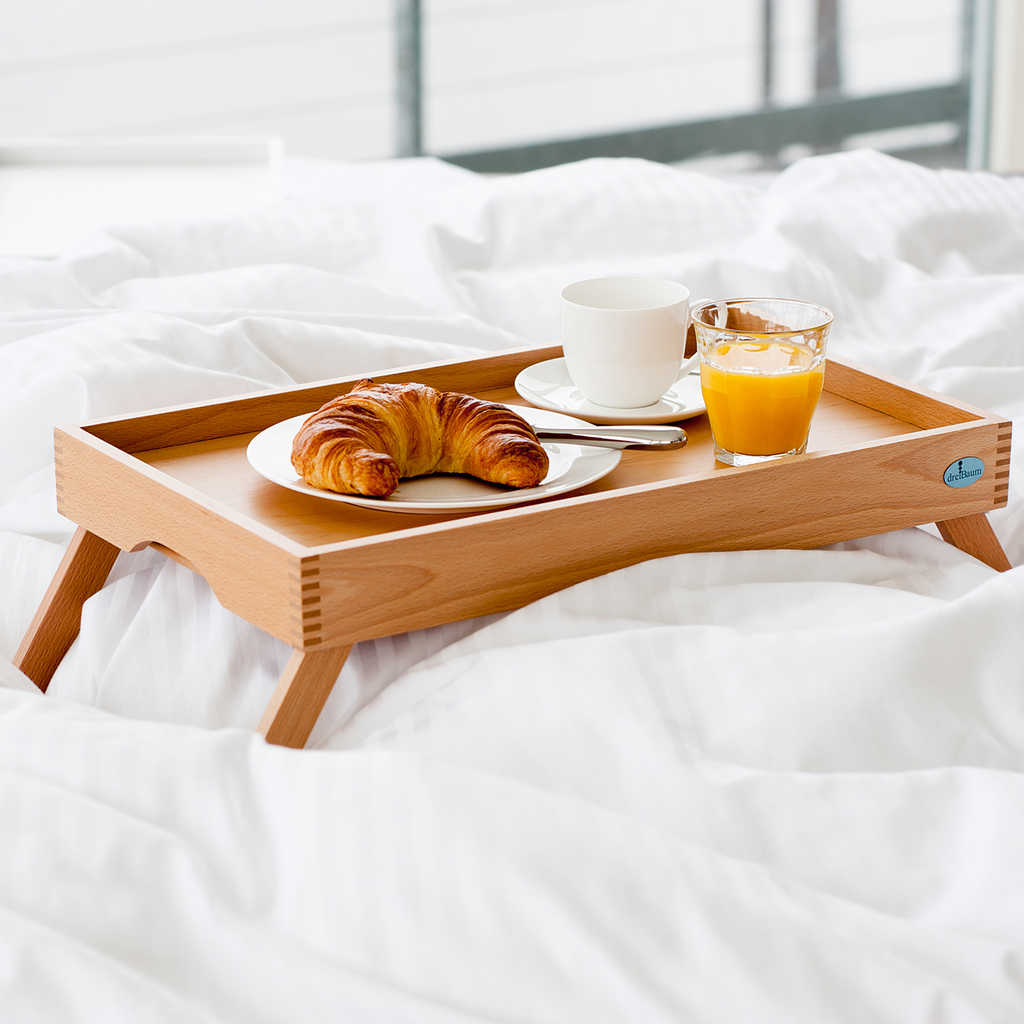 Klassisches Betttablett mit einklappbaren Beinen. Außerhalb des Betts benutzt man es wie ein ganz normales Tablett. Magnete sind dazu da, dass die Beine nicht ausklappen, wenn das Tablett getragen wird.