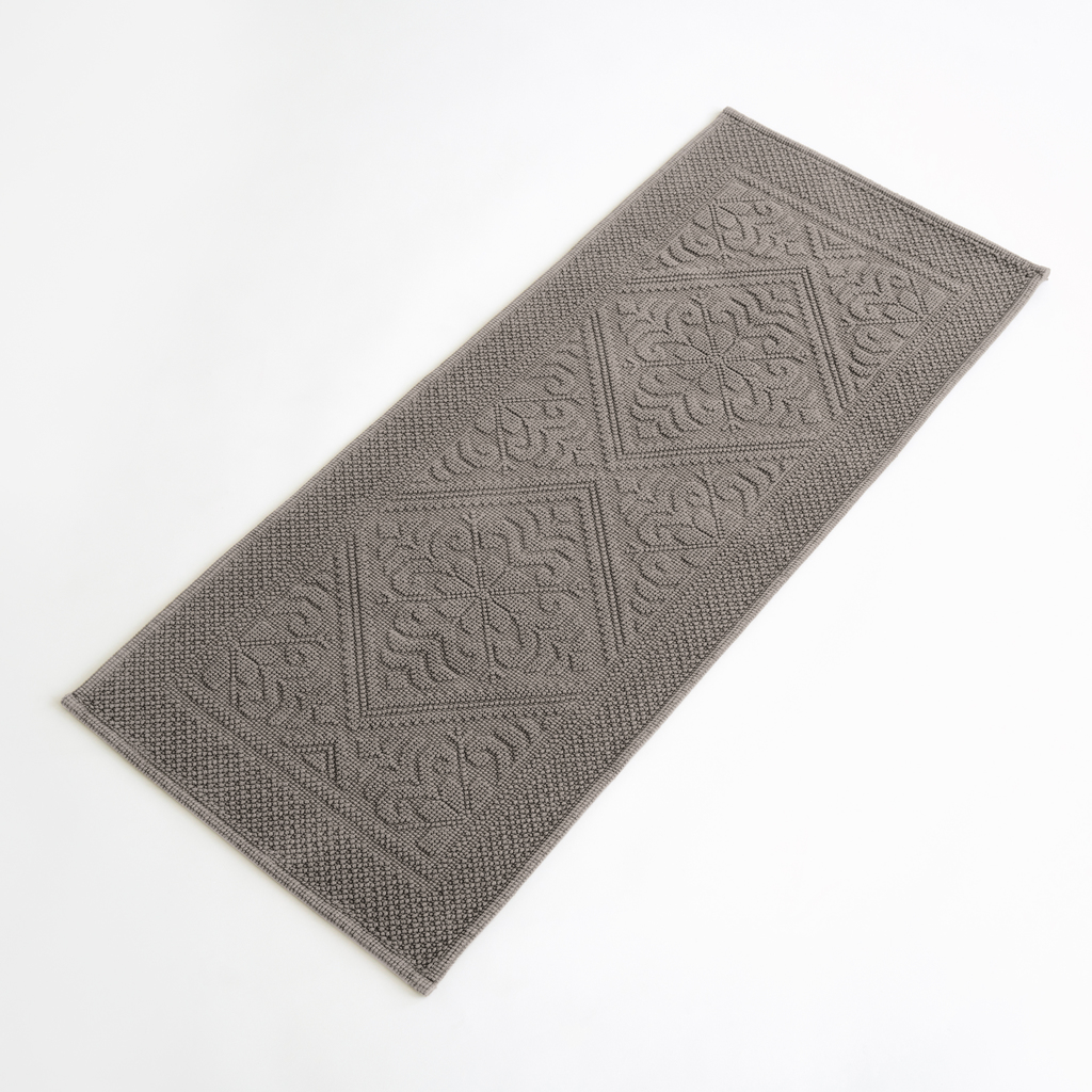 Diese als Bettvorleger und Badezimmerteppiche gleichermaßen geeigneten Matten sind robust und saugfähig – zudem fühlt sich ihre starke Reliefstruktur angenehm unter den Füßen an. Sie stammen aus einer kleinen Weberei mit Familientradition im Nordosten Portugals, die seit über 60 Jahren Baumwolle verarbeitet. Auf den Webstühlen, die zum Teil noch aus der Zeit der Firmengründung stammen werden hier traditionelle Muster gewebt. 100 % Baumwolle für hohe Strapazierfähigkeit. Waschbar bis 30 °C, 5 % Einlauf. Die kleinen Größen (Noppen und Rahmen) sind nur in Weiß lieferbar.