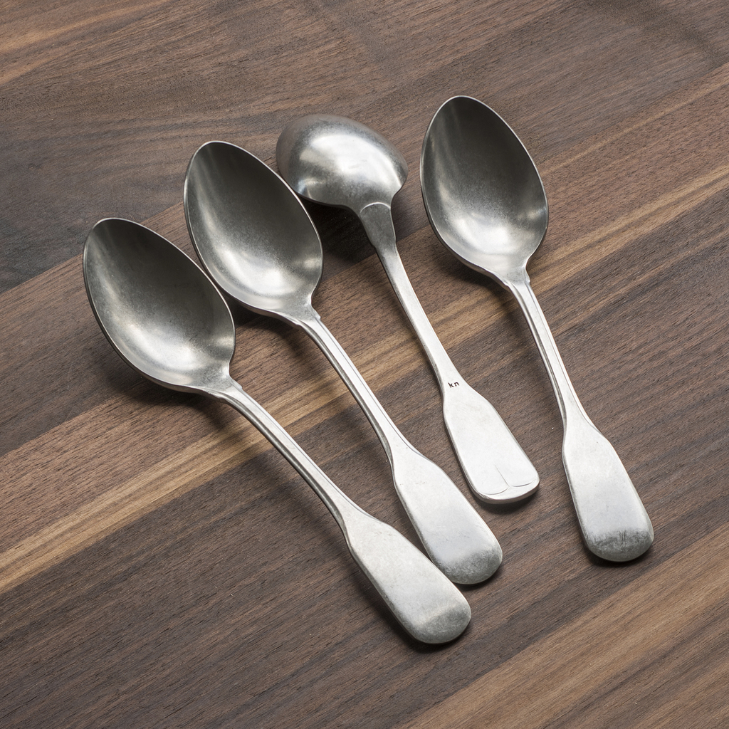 Mit klassischen Formen und einer seidig schimmernden, patinierten Oberfläche wirkt dieses Besteck, als hätte man es seit Jahrzehnten mit Freude im täglichen Gebrauch – oder soeben als echten Flohmarktschatz aufgestöbert. Tatsächlich handelt es sich jedoch um fabrikneue Ware in erstklassiger Ausführung von einem auf anspruchsvolles Küchenmaterial spezialisierten Unternehmen in der Lombardei. Der besondere Effekt entsteht durch Waschung mit feinen Porzellankieseln, die im harten Metall ein feines, unregelmäßiges Muster hinterlassen – stone washed.