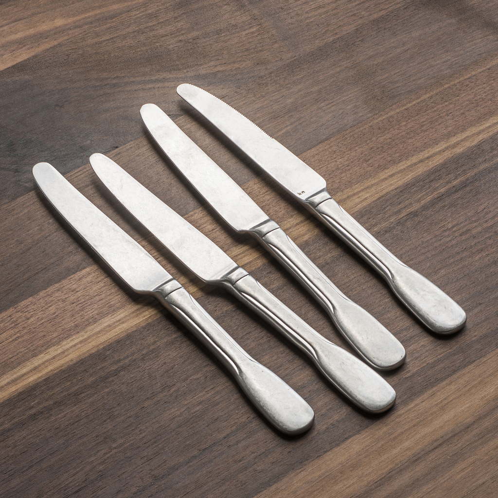 Mit klassischen Formen und einer seidig schimmernden, patinierten Oberfläche wirkt dieses Besteck, als hätte man es seit Jahrzehnten mit Freude im täglichen Gebrauch – oder soeben als echten Flohmarktschatz aufgestöbert. Tatsächlich handelt es sich jedoch um fabrikneue Ware in erstklassiger Ausführung von einem auf anspruchsvolles Küchenmaterial spezialisierten Unternehmen in der Lombardei. Der besondere Effekt entsteht durch Waschung mit feinen Porzellankieseln, die im harten Metall ein feines, unregelmäßiges Muster hinterlassen – stone washed.