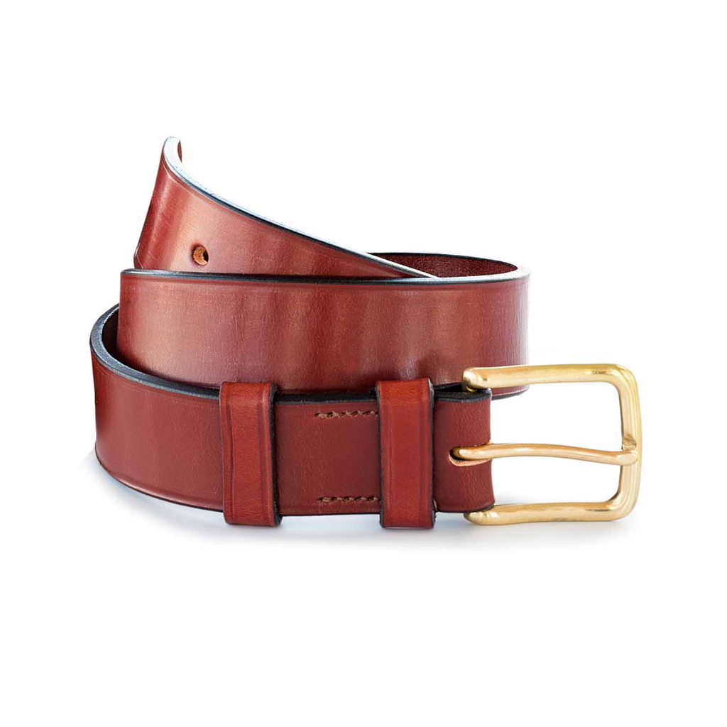 Der Broadway ist ein breiter, eher sportlicher Gürtel, den man zu Jeans-, Cord- oder Khakihosen tragen kann. Er wird in einem kleinen lederverarbeitenden Betrieb im englischen Worcestershire aus einem Stück Sattelleder hergestellt. Da man auf diese Weise ohne Futter und Nähte an den Kanten auskommt, ist der Gürtel sehr strapazierfähig und deutlich langlebiger als ein genähter Gürtel. Schnalle aus Messing. Wird mit zunehmendem Alter immer schöner.