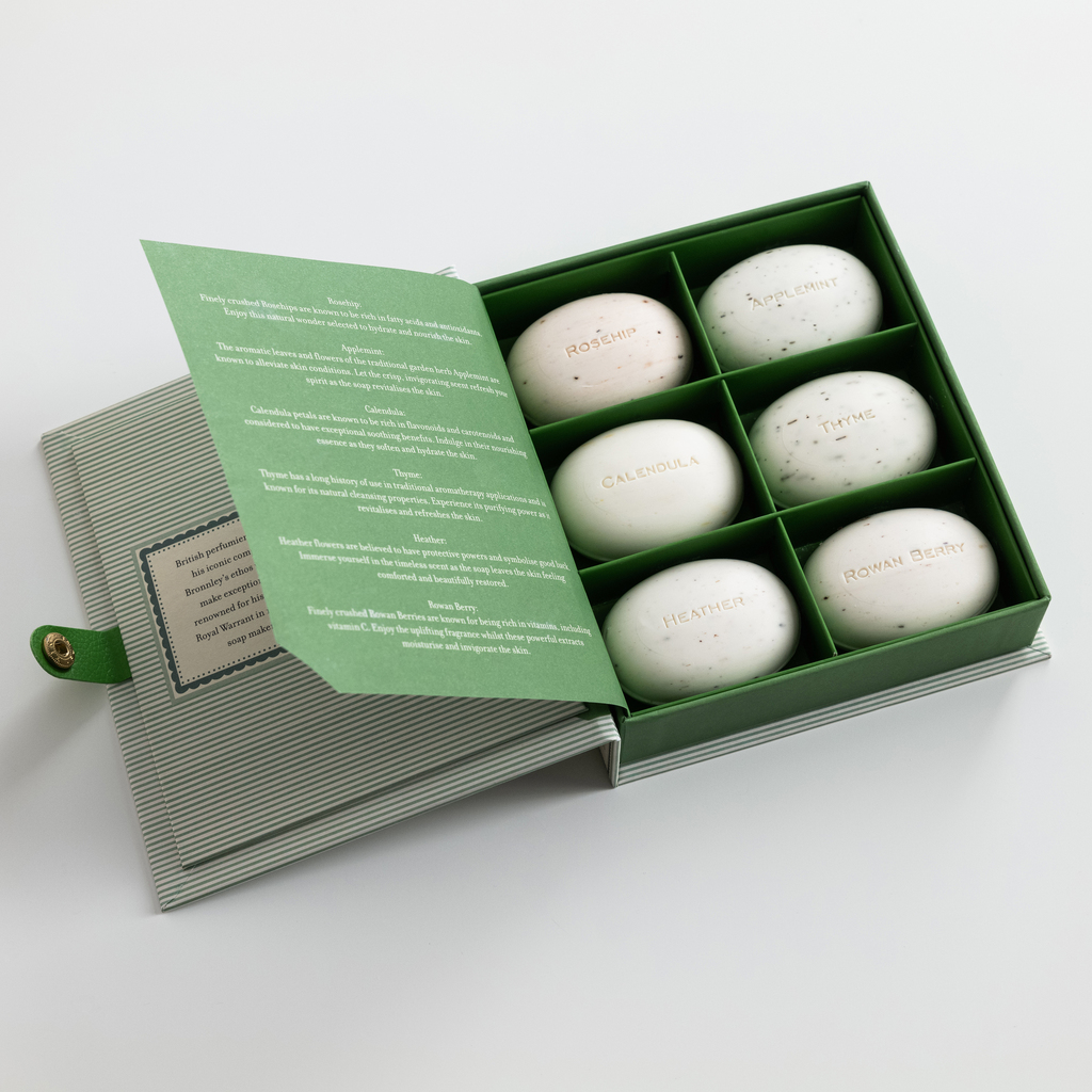 Wie ein Buch öffnet man die aufwendig gearbeitete Geschenkkassette, in der sechs kleine Seifenstücke den wunderbaren Duft verschiedener Kräuter und Blüten verströmen. Bei der Kollektion hat sich der 1884 gegründete Seifenhersteller und Hoflieferant des britischen Königshauses Bronnley vom Sammeln getrockneter und gepresster Pflanzen inspirieren lassen. Jedes Seifenstück ist aus reinem Pflanzenöl nach althergebrachten Rezepturen dreifach gesiedet und mit natürlichen Kräuterextrakten und kleinen Pflanzenteilen von Hagebutte, Apfelminze, Ringelblume, Thymian, Erika oder Eberesche angereichert. 6 Seifenstücke à 50 Gramm in Geschenkschachtel 14,5 x 16,5 x 4 cm.