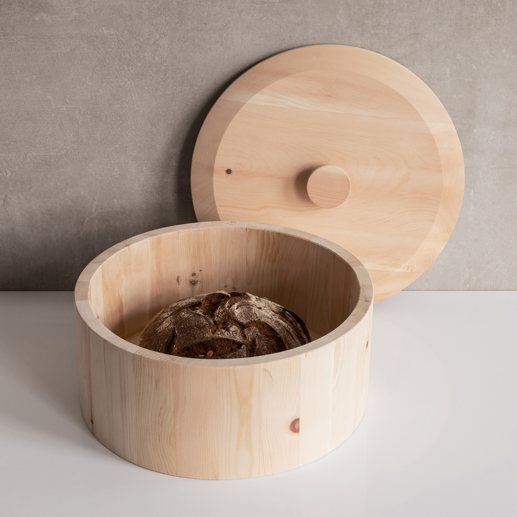 Handwerklich hergestellter Brottopf aus duftendem Zirbenholz, dessen Gehalt an ätherischen Ölen Schimmelbildung vorbeugt. Darin aufbewahrtes Brot bleibt deutlich länger frisch, ohne auszutrocknen. Entnehmbarer Holzrost.