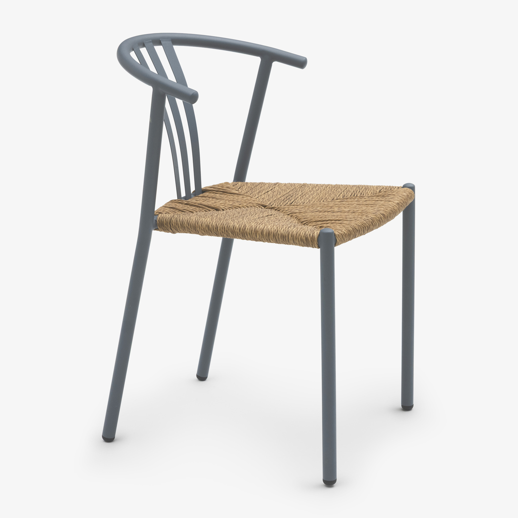 In dieser Interpretation wird die klassische Formgebung konsequent für den Außenbereich übersetzt. Das Gestell aus pulverbeschichtetem Metall – erhältlich in dezentem Salbei und einem ruhigen Grau – ist witterungsbeständig und leicht. Die Sitzfläche besteht aus einem robusten, naturfarbenen Polyrattan-Geflecht, das im traditionellen Kuvert-Muster gearbeitet ist.