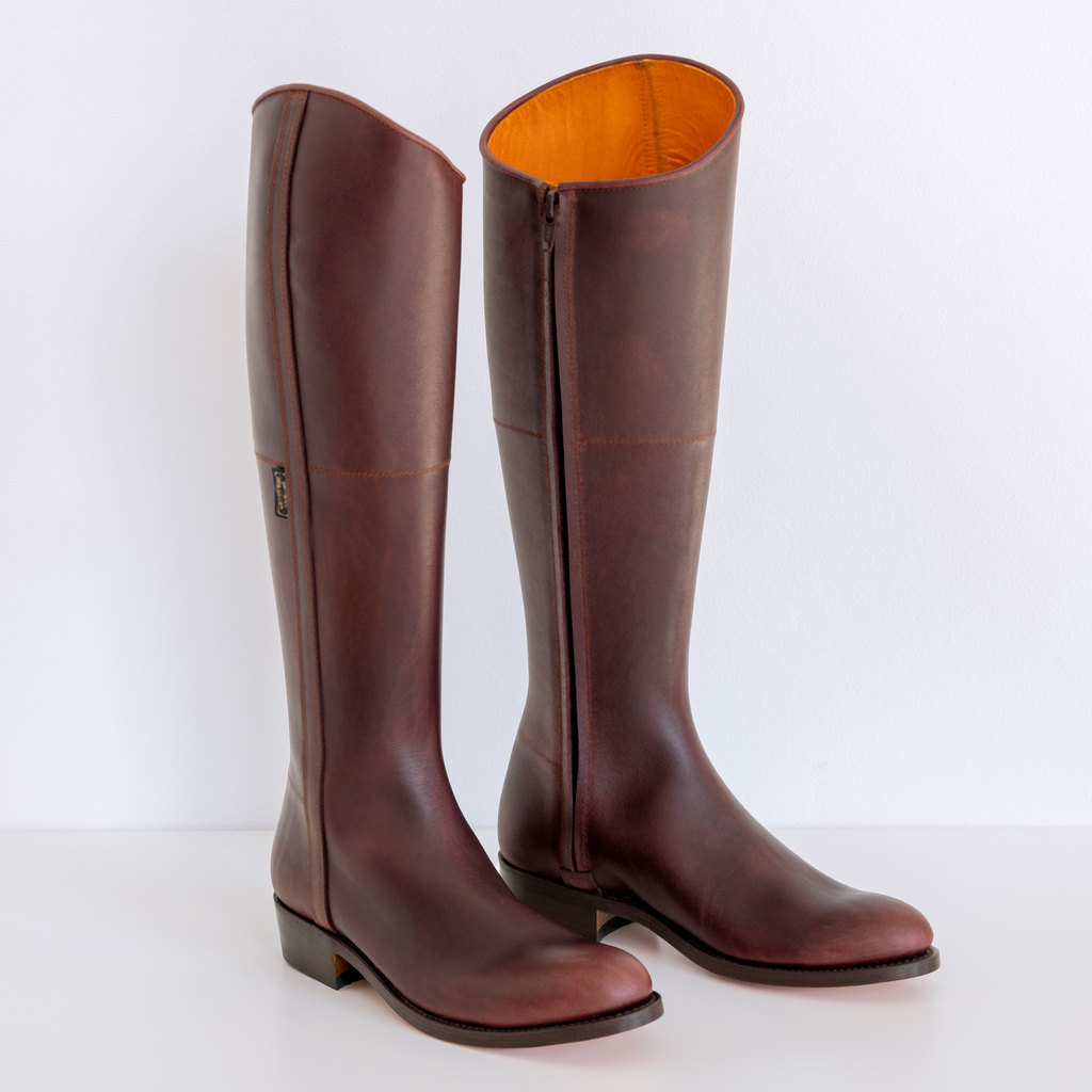 Aus dem andalusischen Valverde del Camino stammen diese eleganten und zugleich robusten Damenstiefel im Schnitt spanischer Reitstiefel. Der hohe Schaft aus geöltem Kalbsleder ist aus mehreren Lederstücken Stoß auf Stoß zusammengenäht. Das Innenfutter besteht aus weichem Hirschleder. Das sorgt für einen hohen Tragekomfort. Die rahmengenähte Ledersohle sorgt für einen sicheren Tritt auf jedem Untergrund. Der Stiefel wird im Goodyear-Verfahren gefertigt, einer der anspruchsvollsten Techniken im Schuhmacherhandwerk. Diese Fertigungsweise bewirkt, dass die Sohle abgenommen werden kann, ohne den Rest des Stiefels zu beschädigen, sie kann also immer wieder ersetzt werden. Bei regelmäßiger Pflege bleibt das hochwertig verarbeitete Leder geschmeidig und entwickelt mit der Zeit eine sehr schöne Patina. Der Stiefelschaft sitzt eng am Unterschenkel und ist mit einem Reißverschluss versehen.