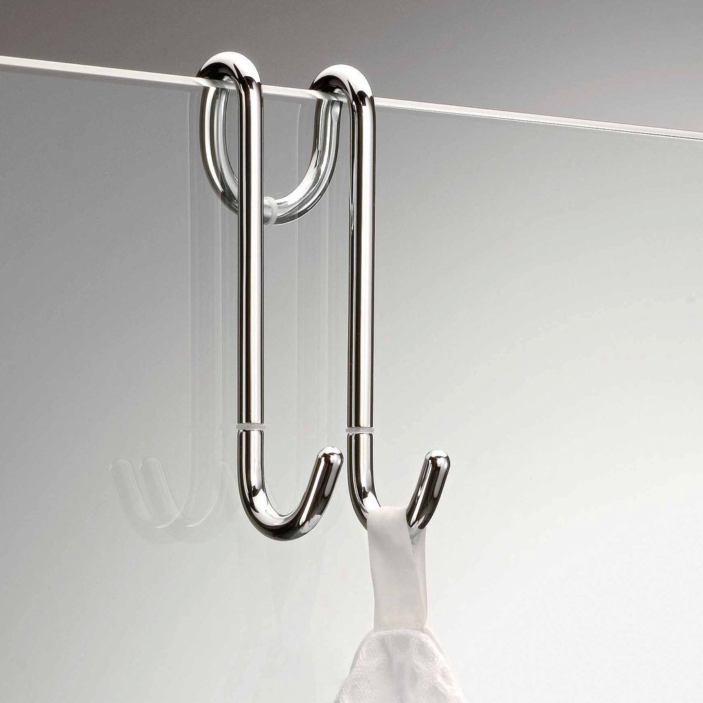 Mit diesem Doppelhaken, der über die obere Kante einer gläsernen Duschabtrennung gehängt wird, schafft man ohne Bohren eine flexible Aufhängmöglichkeit. Für Waschlappen, Schwamm oder Kordelseife (in der Dusche) bzw. Bademantel oder Handtuch (außerhalb der Dusche). Drei dünne Gummiringe sorgen für einen rutschfesten Sitz. Geeignet für Duschabtrennungen bis zu einer maximalen Stärke von 1,2 cm.