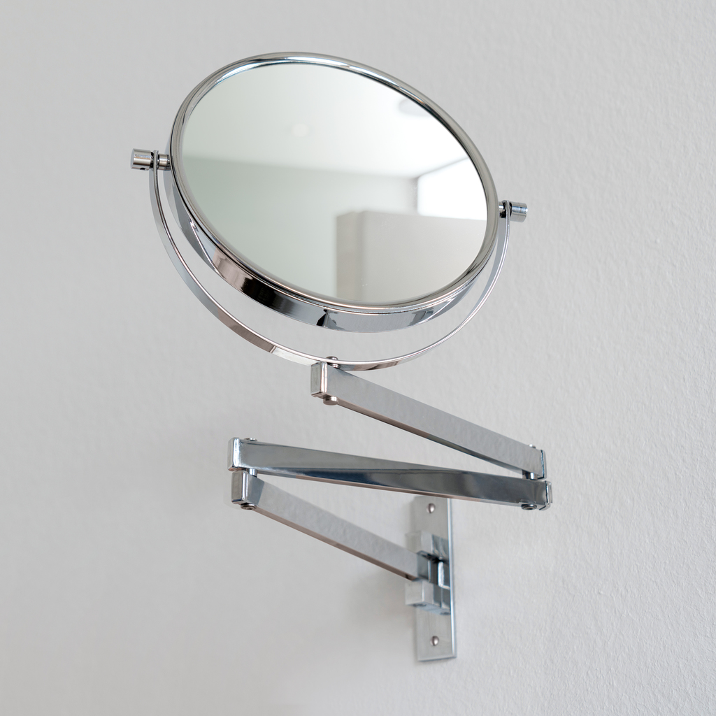 Spiegel zur Wandmontage mit dreiteilig ausziehbarem und schwenkbarem Arm. Der Spiegel ist um die Quer- und um die Längsachse drehbar, auf der Rückseite befindet sich ein Spiegel mit 5-facher Vergrößerung. Metallteile aus verchromtem Messing.