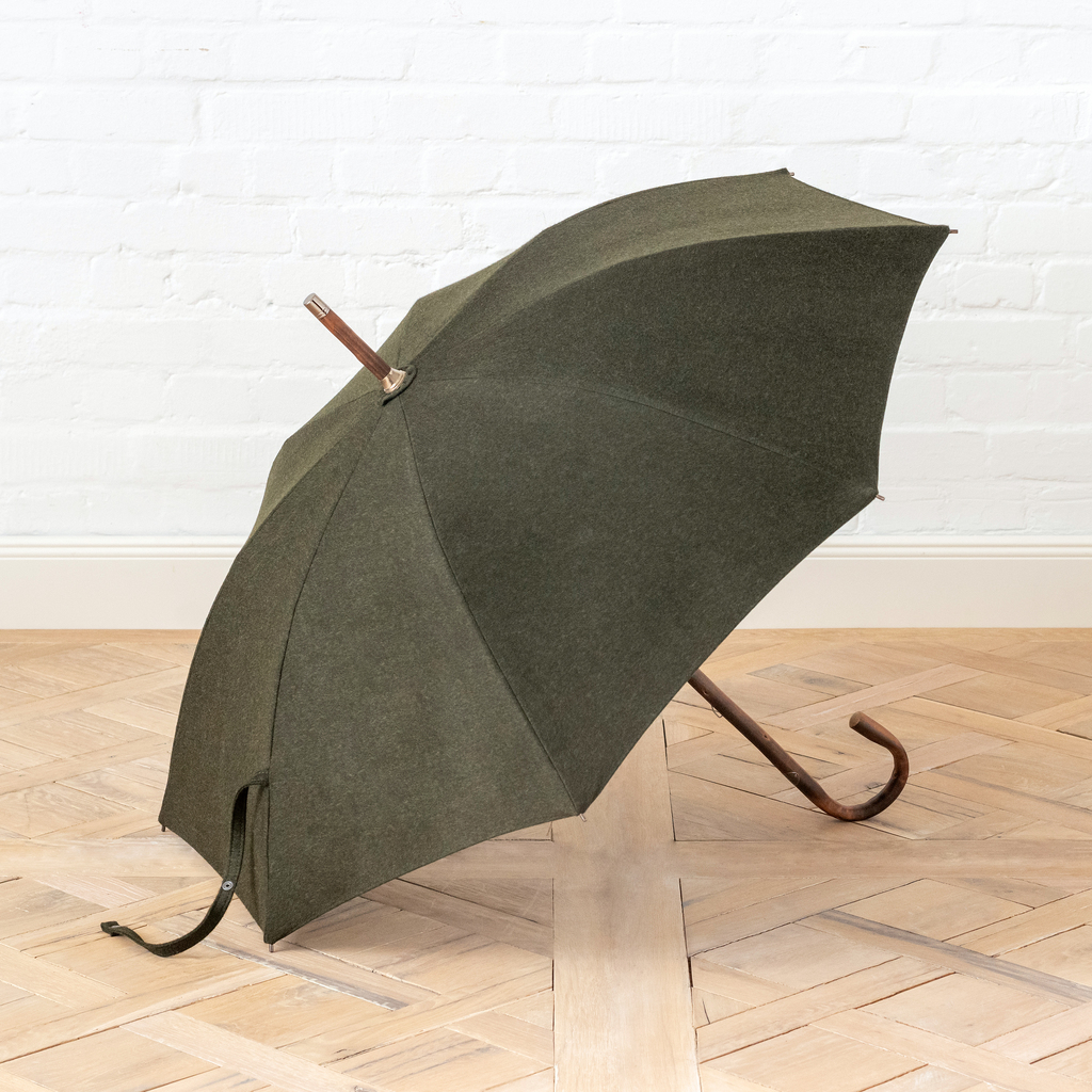 Trotz der Bespannung aus Loden ein Regenschirm, der mehrere Stunden Regen abhält, und ein besonders eleganter Begleiter zugleich. Von Hand zu öffnender Regenschirm mit durchgehendem, stützfähigem Schirmstock. 8-teilige Bespannung aus in der Steiermark gewirktem grünen Loden (reine Wolle).