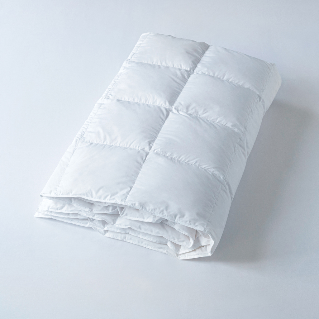 Im Münsterland von Dorma Vita für Torquato hergestellte Bettdecke mit ebenfalls aus dem Münsterland stammenden Daunen und Federn. Die Bettdecke ist vollständig mit Landdaunen Klasse I gefüllt und kassettiert, um ein Verrutschen zu verhindern. 8 x 11 Kassetten, Füllgewicht 290 g.