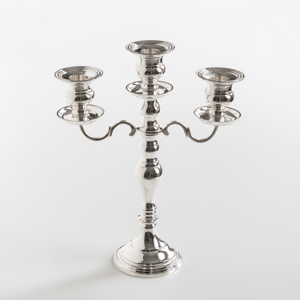 Ein prachtvoller Kerzenleuchter für die festlich gedeckte Tafel: aus massivem Messing gearbeitet und mit einer Versilberung versehen, wie man es von vielen ähnlichen Leuchtern aus dem Antiquitätenhandel kennt. Soll der helle Silberglanz erhalten bleiben, ist gelegentliches Polieren erforderlich, ansonsten nimmt die unbehandelte Oberfläche im Laufe der Zeit eine typische Patina an.