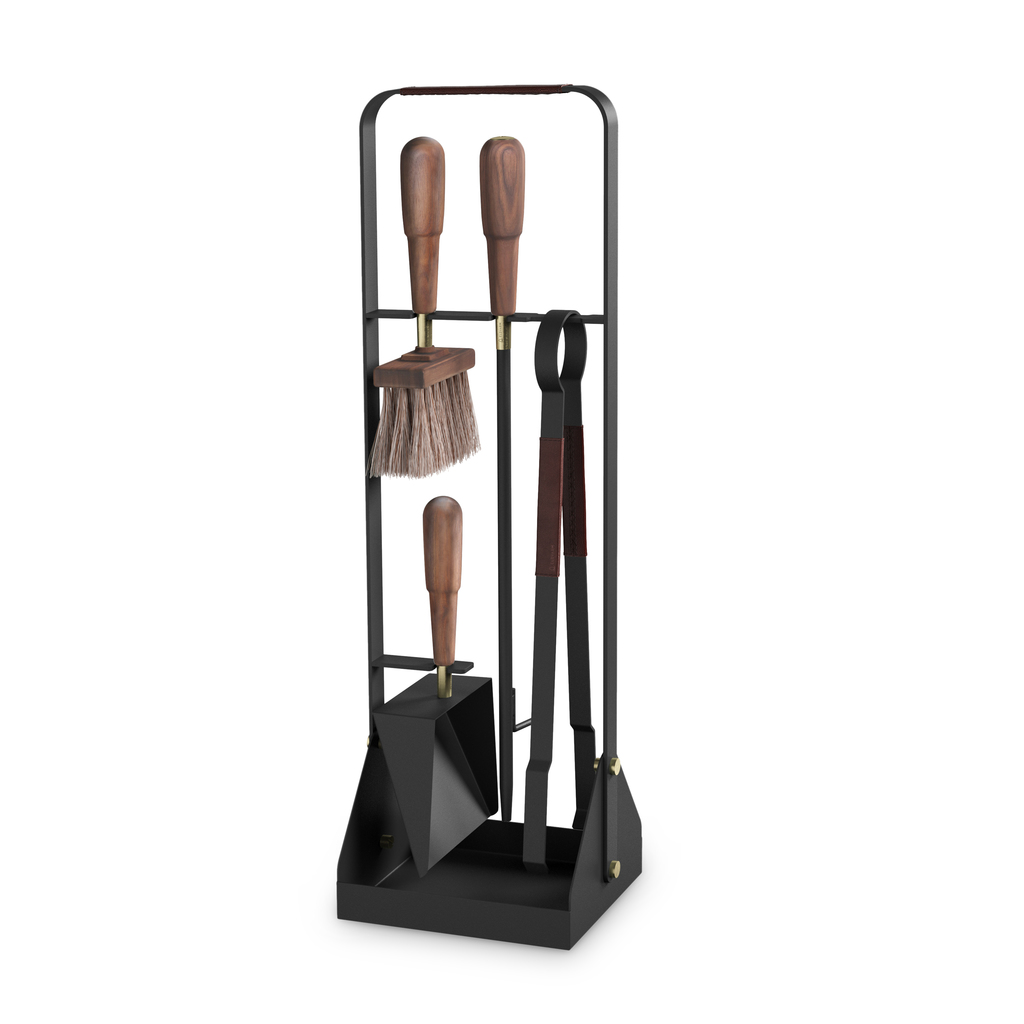 Vierteiliges Kaminbesteck mit Ständer aus pulverbeschichtetem Stahl oder Edelstahl: mit Schürhaken, Kohlenzange, Kehrblech und einer Aschenbürste mit Rosshaar- und Fibre-Besatz, einer Naturfaser aus der mexikanischen Agavepflanze. In den Schürhaken ist ein Kaminanpuster mit Messing-Mundstück integriert, sodass man Luft direkt und wohldosiert in die Glut pusten kann, ohne Asche aufzuwirbeln. Besatz (wo vorhanden) aus pflanzlich gegerbtem Leder. Griffe aus Walnuss- oder Birkenholz.