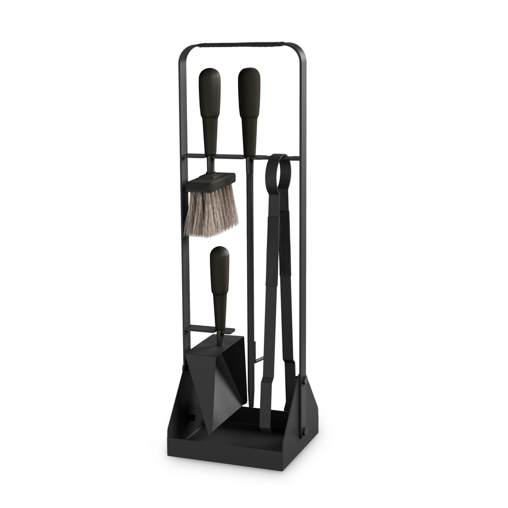 Vierteiliges Kaminbesteck mit Ständer aus pulverbeschichtetem Stahl oder Edelstahl: mit Schürhaken, Kohlenzange, Kehrblech und einer Aschenbürste mit Rosshaar- und Fibre-Besatz, einer Naturfaser aus der mexikanischen Agavepflanze. In den Schürhaken ist ein Kaminanpuster mit Messing-Mundstück integriert, sodass man Luft direkt und wohldosiert in die Glut pusten kann, ohne Asche aufzuwirbeln. Besatz (wo vorhanden) aus pflanzlich gegerbtem Leder. Griffe aus Walnuss- oder Birkenholz.