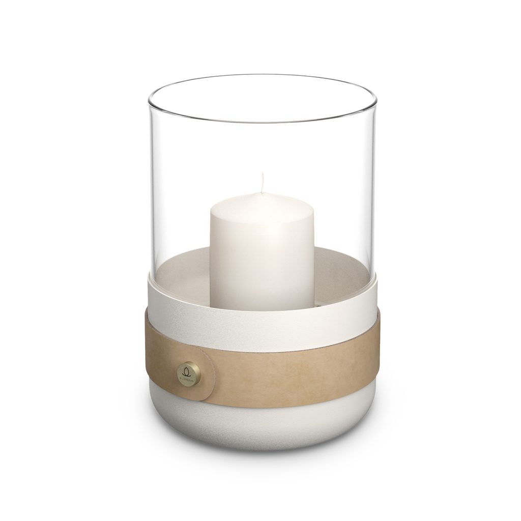 Zylindrisches Windlicht aus mundgeblasenem Glas in einer Schale aus pulverbeschichtetem Stahl mit umlaufendem Riemen aus pflanzlich gegerbtem Leder. Das Windlicht wird ohne Kerze geliefert.