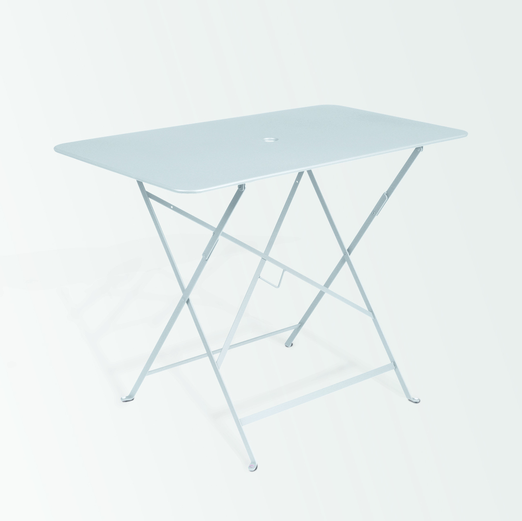 Kleiner, rechteckiger klappbarer Bistrotisch von Fermob in Frankreich. Die Fa. Fermob hat sich der Fertigung von Möbeln für den Außenbereich - vornehmlich aus Metall - verschrieben. So stammt das Mobiliar unzähliger Straßencafés und Bistros sowie öffentlicher Parks und Gärten (z.B. im Jardin de Luxembourg in Paris) von Fermob.