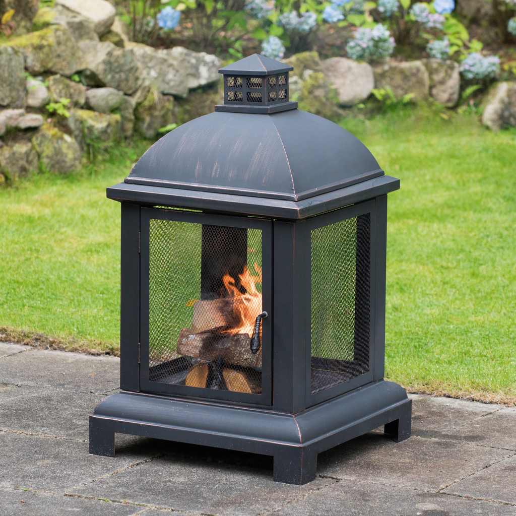 Große Feuerlaterne für den Einsatz auf der Terrasse und im Freien. Auffällig ist die betont offene Gestaltung: Das kuppelartige Dach mit aufgesetzter Laterne wird nur von den vier Eckpfeilern getragen. Die eigentlichen Wände dagegen bestehen auf allen vier Seiten aus einem Drahtnetz, das aus jeder Richtung freien Blick auf das Feuer bietet, dabei aber das Auffliegen größerer Funken unterbindet. Große Vordertür mit Griff für leichten Zugang zum Brennraum. Entnehmbare Brennschale. Hergestellt aus hitzefest lackiertem Stahlblech – leicht beriebene Stellen und Kanten sowie ein damit verbundener, leichter Korrosionsansatz sind Bestandteil der Gestaltung und beeinträchtigen die Funktion der Feuerlaterne nicht. Inklusive Schürhaken. Lieferung zerlegt, leichter Aufbau.