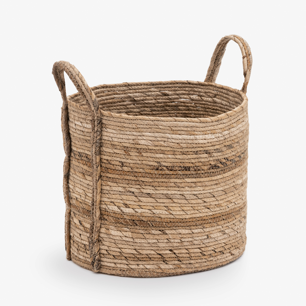 Der handgeflochtene Korb mit zwei stabilen Henkeln besteht aus indonesischem Bananenblatt, einem äußerst robusten und gleichzeitig flexiblen Material. Sein großzügiges Fassungsvermögen macht ihn zur schönen Aufbewahrungsmöglichkeit, zum Beispiel für Decken und Kissen neben Sessel und Sofa.