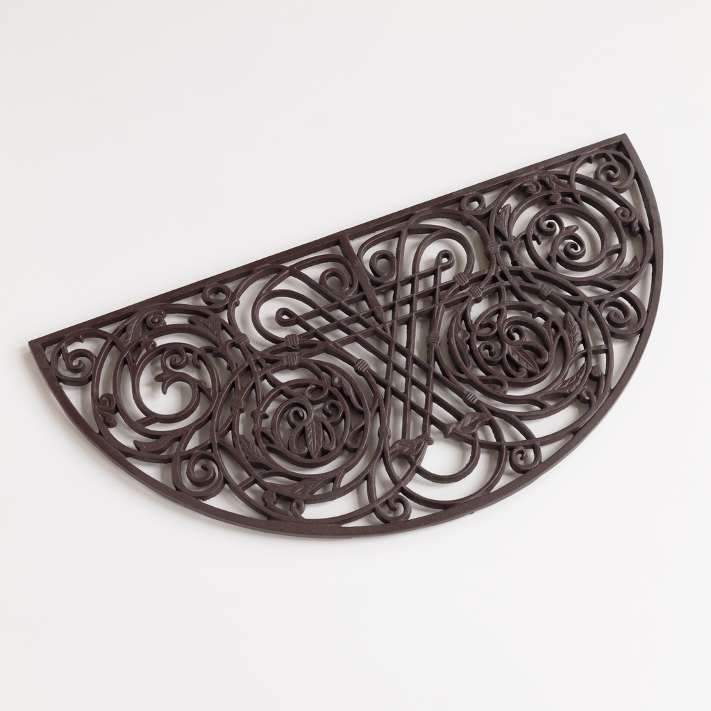Das massive Gusseisen dieses halbkreisförmigen Fußabtreters wird nach dem Gießen vollständig mit Schutzlack überzogen. Gummifüße schützen den Untergrund gegen Zerkratzen.