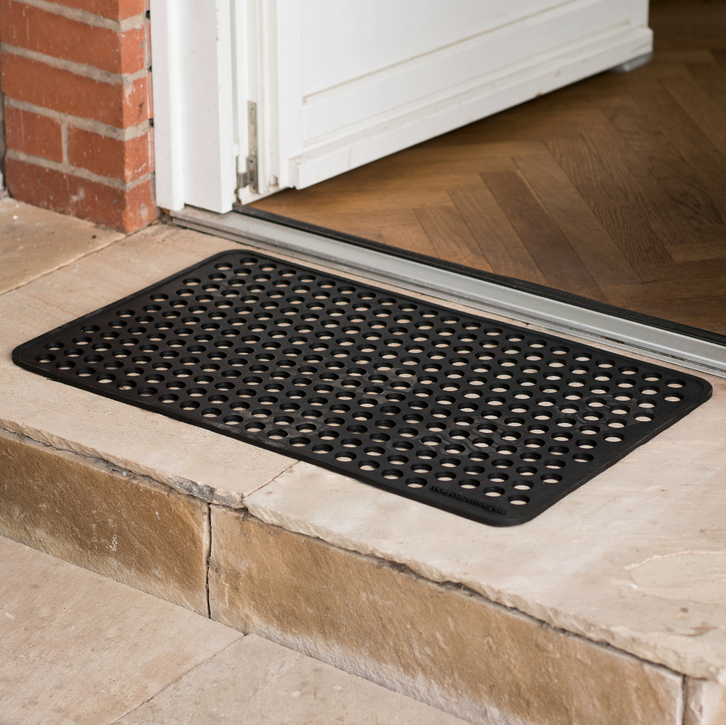 Schwere Fußmatte aus perforiertem Gummi für den Einsatz vor und hinter der Haustür. An den Schuhen haftender Schmutz lässt sich an den Löchern der Matte gut abstreifen. Die Matte kann ganzjährig im Freien bleiben und ist schwer genug, um nicht versehentlich oder durch Windeinwirkung zum Verlassen ihres Postens bewegt zu werden. Schwarzer Gummi mit 60 % Recyclinganteil.