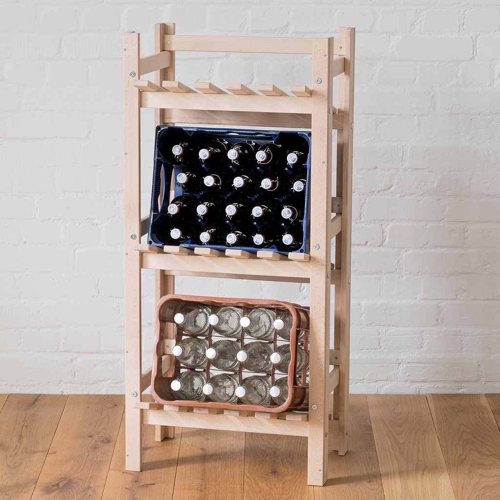 Stellt man Getränkekisten nebeneinander, verbrauchen sie viel Platz. Stapelt man sie, wird man zuverlässig am häufigsten Flaschen aus der untersten Kiste brauchen. Dieses stabile Holzgestell fasst auf kleinem Raum drei Kästen, aus denen die Flaschen bequem herausgezogen werden können. Die Neigung der Fächer verhindert das Herausrutschen der Flaschen. Unbehandeltes Holz. Lieferung zerlegt, einfache Montage.