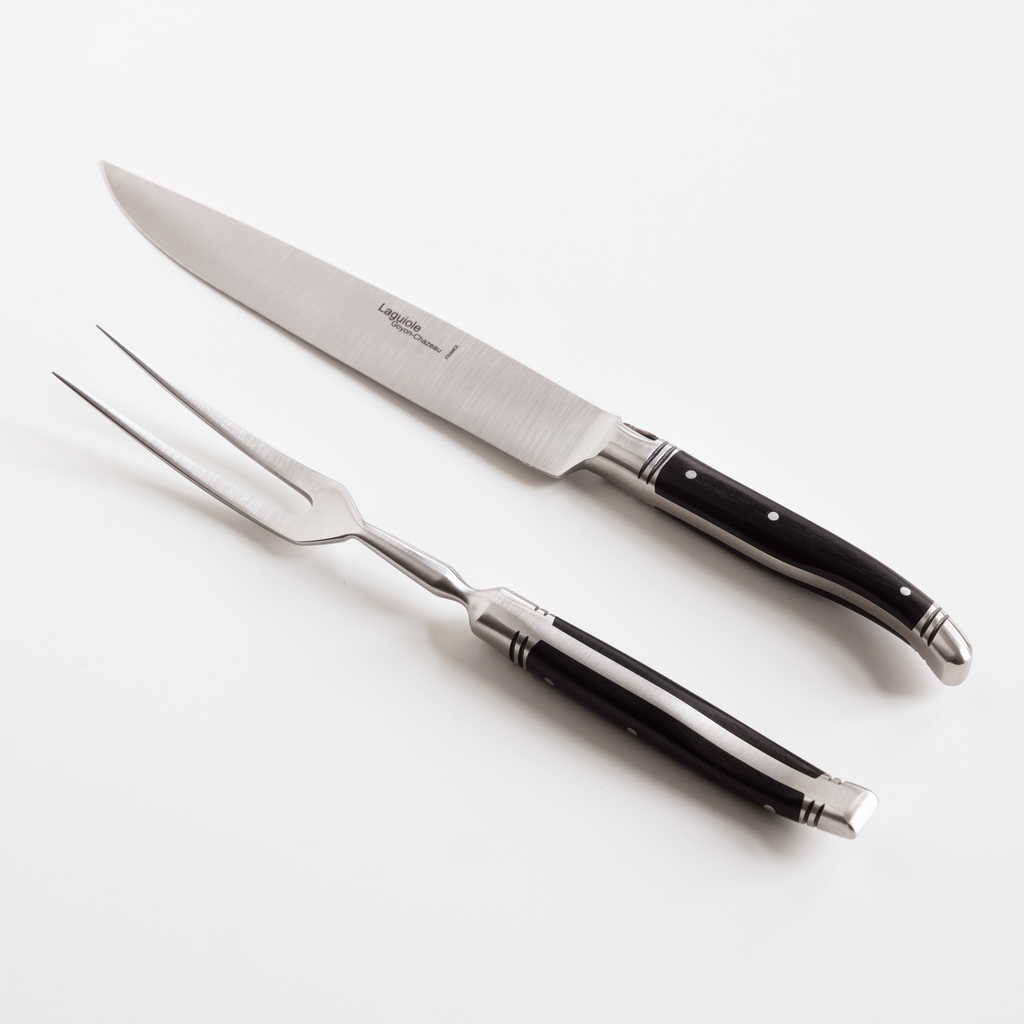 Wie unsere Laguiole-Steakmesser stammt dieses handgeschmiedete Tranchierbesteck aus der in Thiers in der Auvergne ansässigen Messerschmiede Goyon-Chazeau. Diese gehört zu den kleinen und hochspezialisierten Messerherstellern Frankreichs und schmiedet in herausragender Handwerkskunst Messer aus einem einzelnen Stück gehärtetem Messerstahl: Klinge, Heft und Kappe werden also nicht aus Einzelteilen zusammengesetzt, sondern sind von Anfang an durchgehend miteinander verbunden. Ein so gefertigtes Messer verfügt über eine unvergleichliche Stabilität bei solidem Gewicht und liegt perfekt ausbalanciert in der Hand.