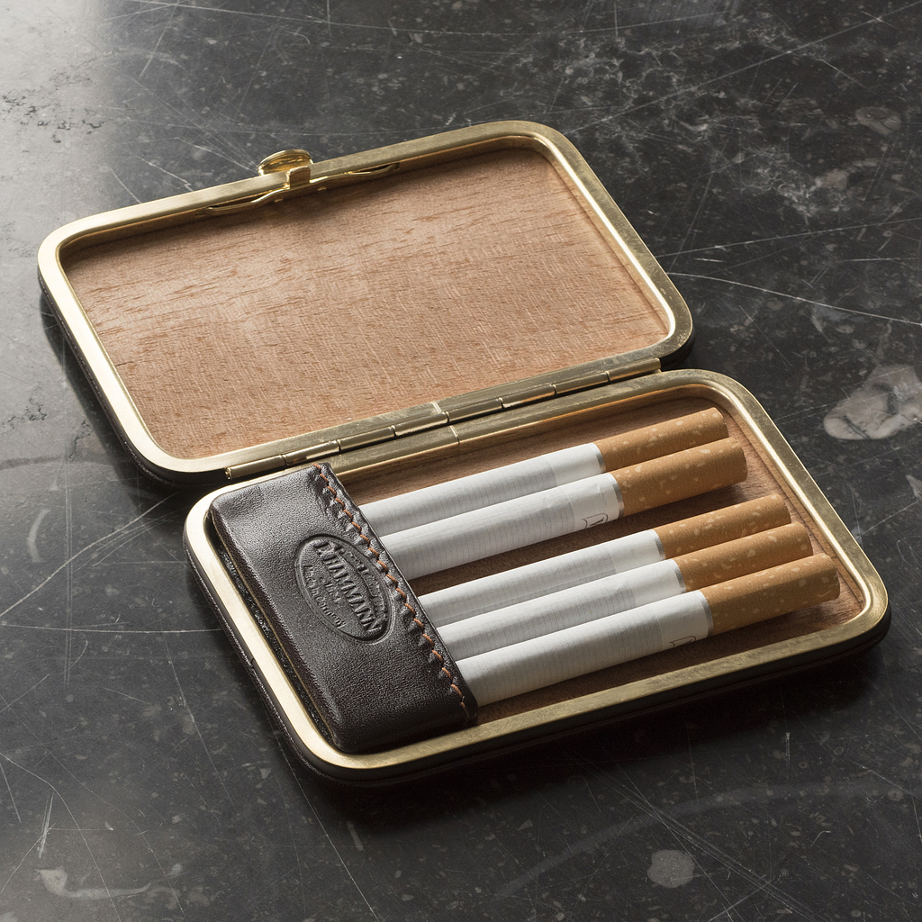 In enger Zusammenarbeit mit uns hat die seit 1864 bestehende Traditionsfirma Franz Hammann aus Offenbach eine Serie von Etuis mit Messingrahmen exklusiv für Torquato entwickelt. Die Herstellung der Rahmen aus dem spröden, aber sehr langlebigen Messing erfordert große Erfahrung, deshalb wird heute meistens Stahl verwendet. Vor allem fanden wir aber Messing schöner als Stahl. Das Obermaterial ist dunkelbraunes Boxcalf-Leder, das Futter ist aus weichem Schweinsveloursleder. Innen mit Zedernholz, so werden die Zigaretten frisch gehalten.
