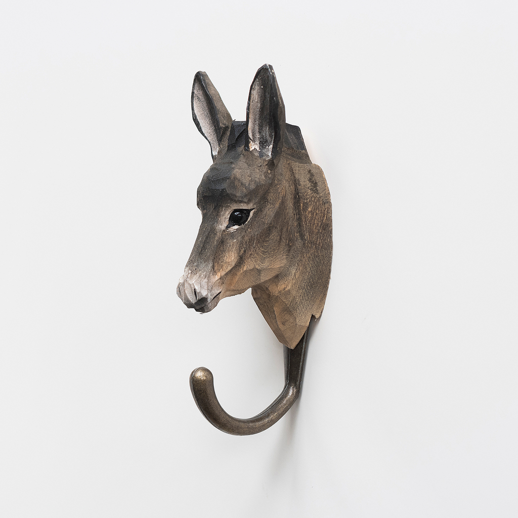 Diese Kleiderhaken bringen tierische Abwechslung an die Wand – und vermitteln wie nebenbei, welche und vor allem wessen Jacke auf welchen Haken gehört. Die Tierköpfe sind von Hand aus Holz geschnitzt und dann mit wasserbasierter Acrylfarbe lackiert: Nuancenreich und fein abgestimmt, so dass ein erstaunlich naturalistischer Eindruck entsteht und sich keine zwei Kühe und keine zwei Esel gleichen. Der eigentliche Haken ist aus Metall und mit dem Tierkopf verschraubt. Zur Montage wird lediglich eine in die Wand versenkte Schraube benötigt: Die Haken werden einfach auf den herausstehenden Schraubenkopf aufgesetzt und arretiert.