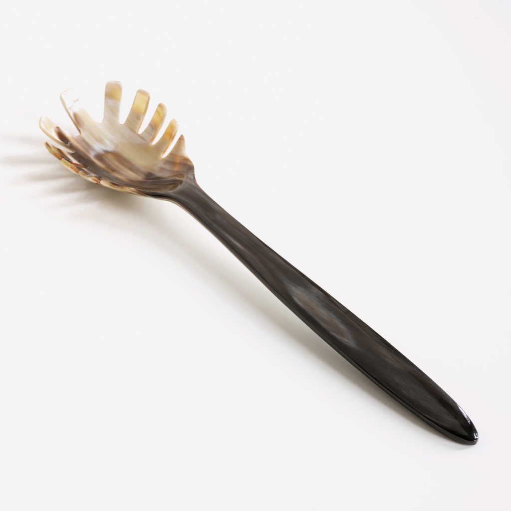 Schöne, handgefertigte Nudelkelle aus Büffelhorn. Statt lange Nudeln wie Spaghetti, Linguine und Co. nach dem Abgießen mit zwei Löffeln zu servieren, hat man mit dem Spaghettilöffel noch eine Hand frei, um den Teller beim Servieren in sicherer Nähe zu halten. Da Horn ein Naturprodukt ist, variiert die Maserung eines jeden Löffels in individuellen Schattierungen von elfenbeinweiß bis ebenholzschwarz.