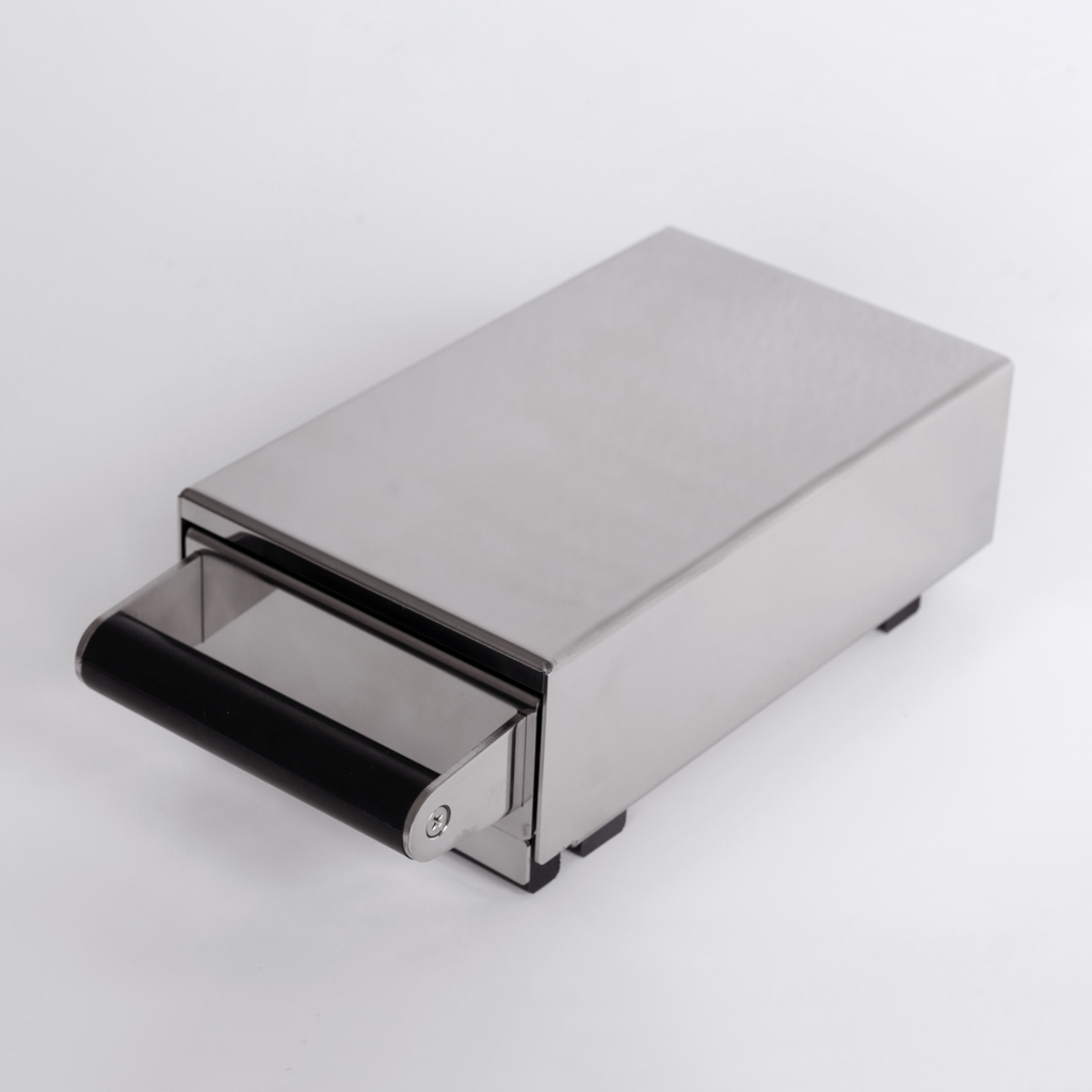 Für die gemeinsame Aufstellung mit einer Espressomühle oder einer kleinen Siebträgermaschine konzipierte Kaffeesatzschublade. Sie dient dem schnellen und einfachen Entsorgen des Kaffeepucks nach dem Espressobezug: In die herausziehbare Schublade ist eine Hartgummiwalze eingelassen, auf der der Siebträger kopfüber mit einem kurzen Schlag entleert wird, sodass er sofort wieder einsatzbereit ist. Schublade und Korpus aus poliertem Edelstahl.