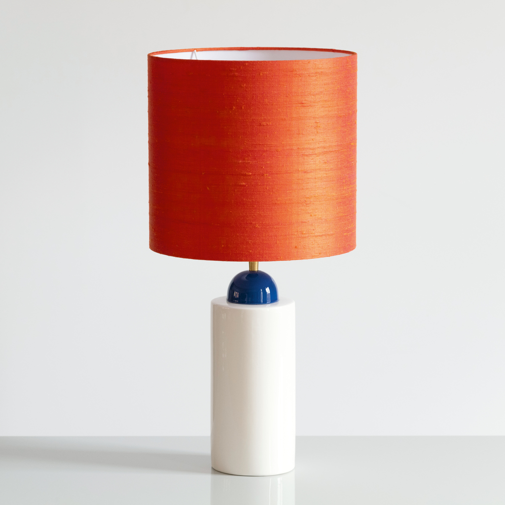 Schirm: reine Seide, orangerot Fuß: Keramik, weiß/kobaltblau glasiert