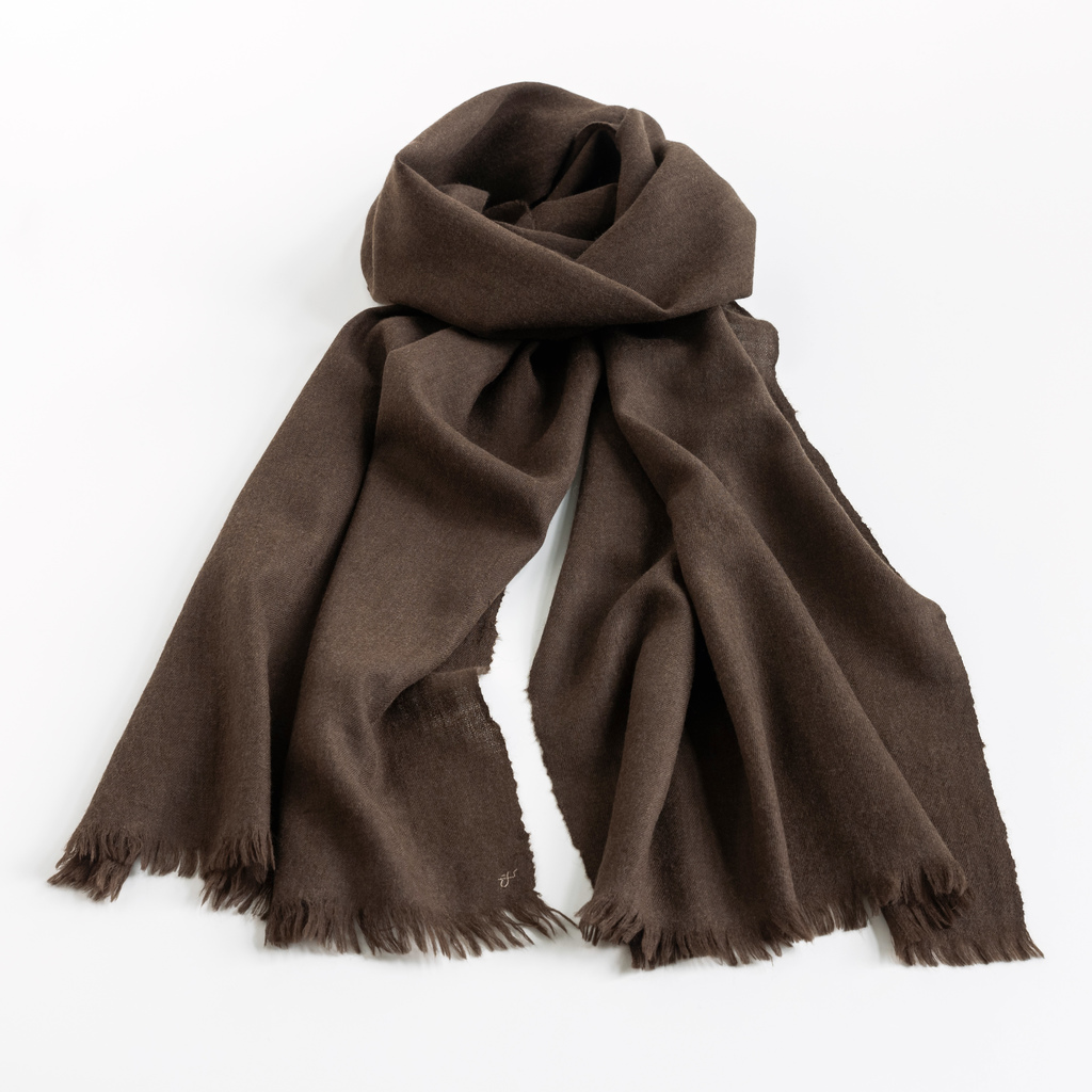 Für diese gänzlich in naturbelassenen Farbtönen gewebten Schals wurden in der Traditionsweberei Kashmir Loom nicht nur Kaschmir verarbeitet, sondern auch hauchdünne Garne aus Yak- und Kamelhaar. Beide gehören wie das Haar der Kaschmirziege zu den Edelhaaren und damit zu den feinsten und weichsten Wollsorten der Welt. Aus ihnen gefertigte Webwaren stehen in Sachen Tragekomfort Kaschmir in nichts nach, sind von luxuriöser Weichheit und Leichtigkeit, temperaturausgleichend und besonders hautfreundlich. Die wenig bekannte Yak-Wolle wird aus dem feinen Unterhaar von langhaarigen, in der Himalaya-Region beheimateten Yak-Rindern durch Auskämmen gewonnen.