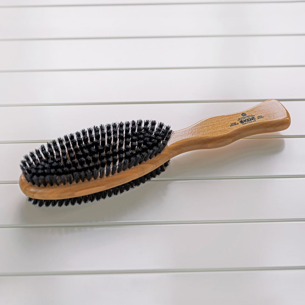 G.B. Kent & Sons produziert seit 1777 Bürsten und trägt als Lieferant des englischen Hofes das Royal Warrant. Die Bürste trägt auf der einen Seite harte Borsten für Hosen, auf der anderen weichere für Jacketts. Die echten Borsten sind handeingezogen.