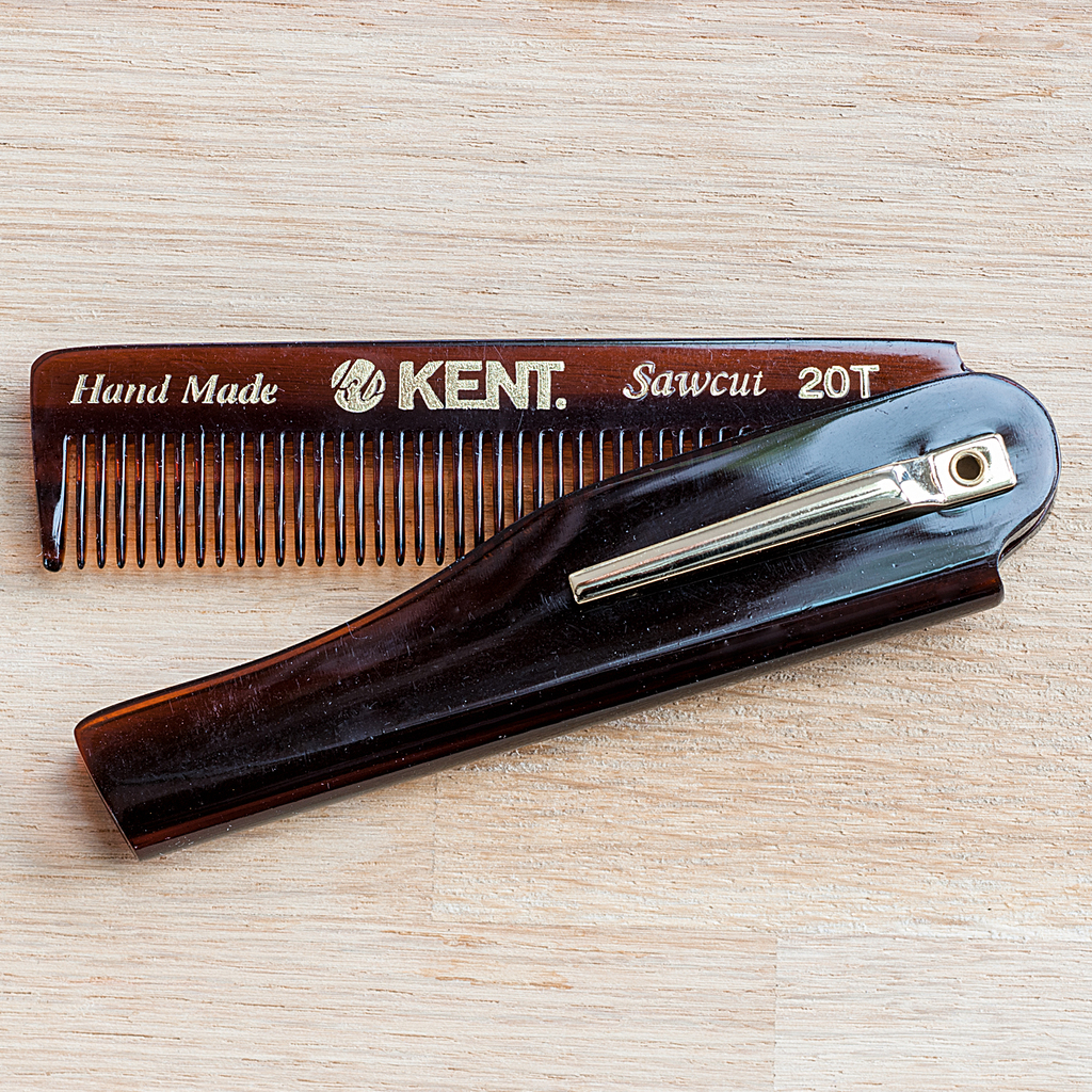 Kamm aus Zellulose-Acetat mit handpolierten Zähnen, schont Haare und Kopfhaut für schonendes Kämmen. Unauffällige Größe und "unverlierbar" durch den Clip. G.B. Kent & Sons produziert seit 1777 Bürsten und trägt als Lieferant des englischen Hofes das Royal Warrant.