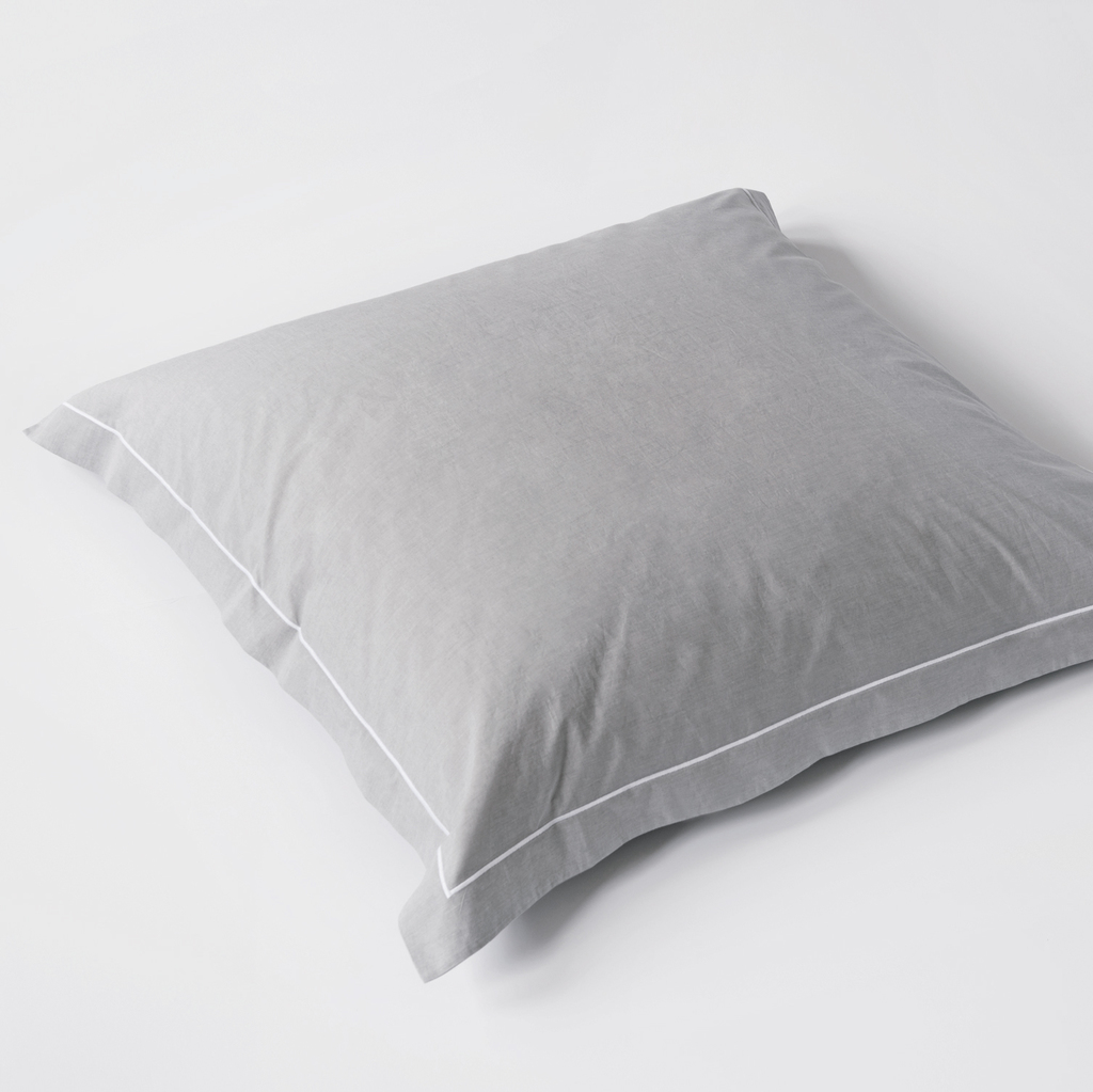 Bettwäsche aus Baumwoll-Perkal mit Stehsaum. Bei Perkal handelt es sich um ein sehr dichtes und dadurch sehr glattes Gewebe - Perkalbettwäsche fühlt sich deshalb besonders angenehm auf der nackten Haut an. Während der Name Perkal bzw. Percale auf das persische Wort "Pargalah" zurückgeht, ist die Herstellung derart beschaffenen Tuches erstmalig für das Jahr 1867 in Wamsutta Mills in New Bedford, Massachusetts erwähnt. Diese Serie wird ausschließlich mit Kammgarn aus langstapeliger Baumwolle mit besonders langen Fasern hergestellt. Während bei gewöhnlichem Gewebe ca. 35 Fäden auf den cm kommen, sind es bei diesem Perkal 60 (Kette) bzw. 40 Fäden (Schuß). Die Bettwäsche ist mit einem umlaufenden 5 cm Oxford-Stehsaum mit breitem Cordstich versehen.