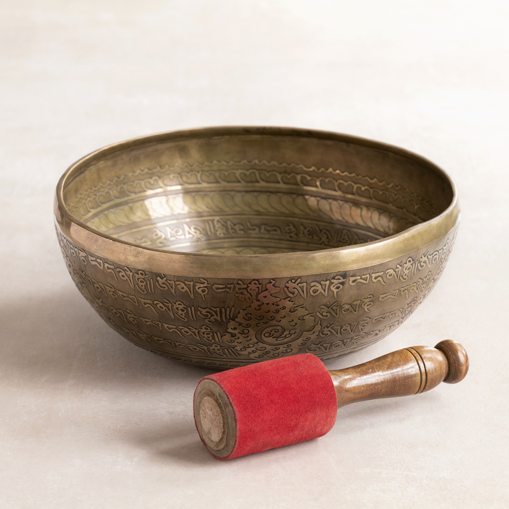 Handgefertigte Klangschale aus Bronze mit Darstellung des in Meditationshaltung sitzenden Siddhartha Gautama und aufwändigem Reliefdekor. Mit dem enthaltenen Holzklöppel mit weichem Wildlederbezug lässt sich die Schale zum Klingen bringen, indem man sie entweder wie einen Gong leicht anschlägt oder außen um den Rand streicht. Dem dadurch entstehenden glockenartigen Klang werden therapeutische Kräfte und eine wichtige Rolle in buddhistischen Ritualen zugeschrieben. Tatsächlich faszinierend ist das erhebliche Entspannungsmoment, das eine Klangschale durch ihren an haltenden Klang und die damit einhergehende, feine Vibration bieten kann, wenn man sie zu Meditationszwecken einsetzt und sich völlig auf ihre schwingende Akustik konzentriert. Da es sich nicht um ein Produkt aus industrieller Herstellung handelt, sind leichte Unregelmäßigkeiten in Form und Dekor ganz normal.