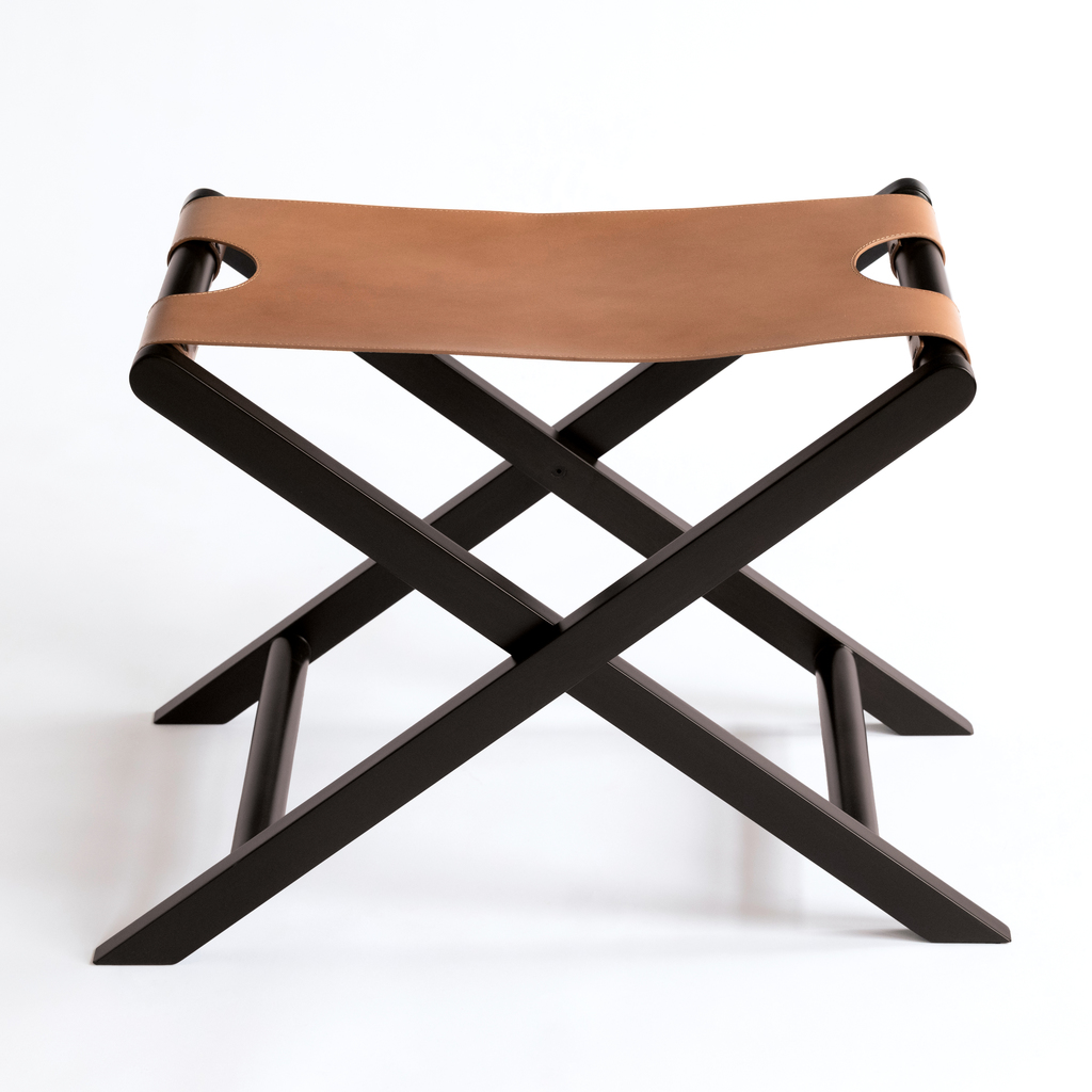Warum sollte man nur im Hotel den Rücken beim Kofferpacken schonen? Auch zuhause liegen die Annehmlichkeiten eines Kofferbocks auf der Hand, denn es packt sich einfacher, wenn sich Reisetasche oder Koffer auf der richtigen Höhe befinden. Unser Kofferbock aus schwarz lackiertem Mangoholz und einer Bespannung aus hellbraunem Büffelleder vereint seine praktische Funktion mit exzellenter Verarbeitung und ansprechender Möbelästhetik. Sichtbar wird das an den ausgeklügelten Details wie der unsichtbaren Verbindung des Klappmechanismus, den abgerundeten Holzprofilen und den Aussparungen des Leders, die das Tragen und Klappen des Kofferbocks erleichtern. Das drei Millimeter starke Leder ist solide am Gestell verschraubt und wird mit der Zeit eine typische Patina entwickeln.