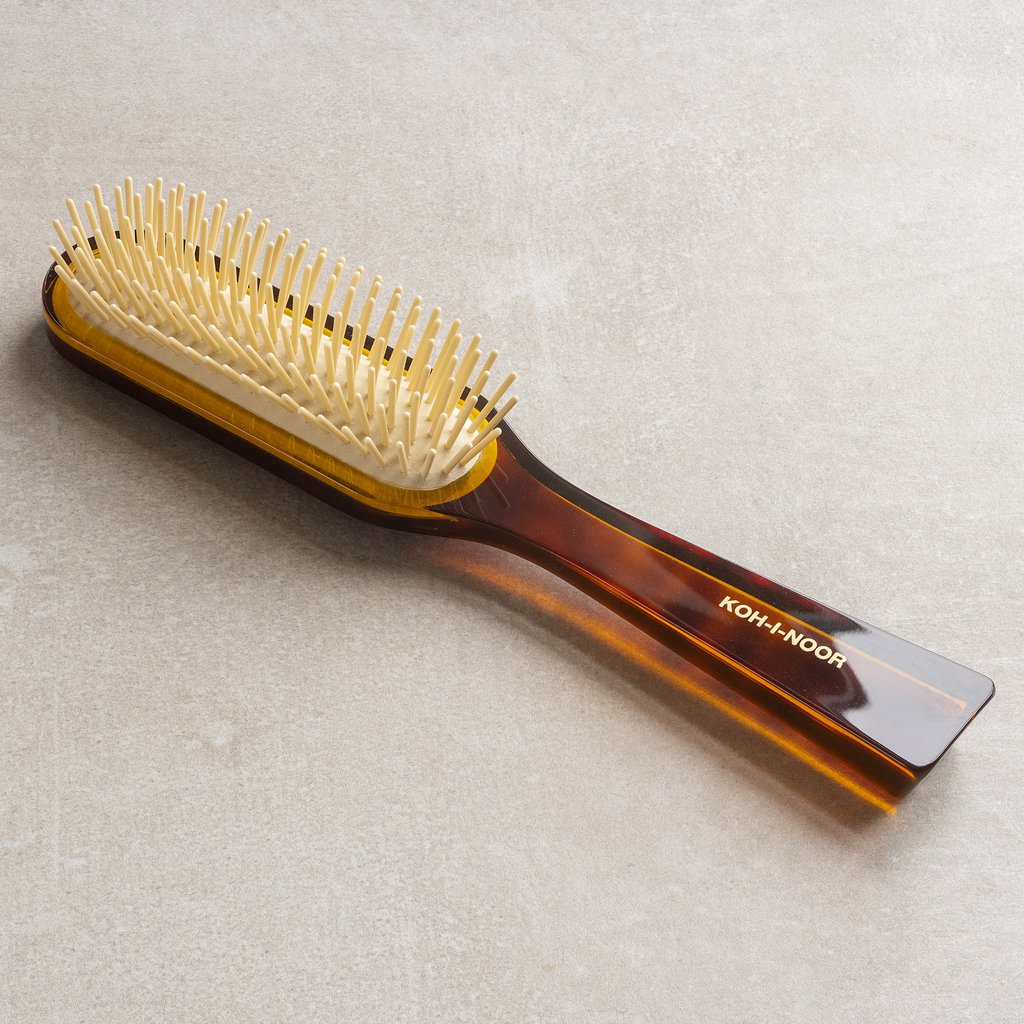 Handgefertigte Haarbürsten von Koh-i-Noor aus der Lombardei: Die luftgepolsterten Bürsten mit zylindrischen Kunststoffstiften eignen sich besonders für langes und lockiges Haar und löst Knötchen schonend. Korpus aus hochwertigem, sehr sauber verarbeitetem Zelluloseacetat mit Hornanmutung. Koh-i-Noor stellt seit 1950 Haarbürsten von internationalem Ruf her.