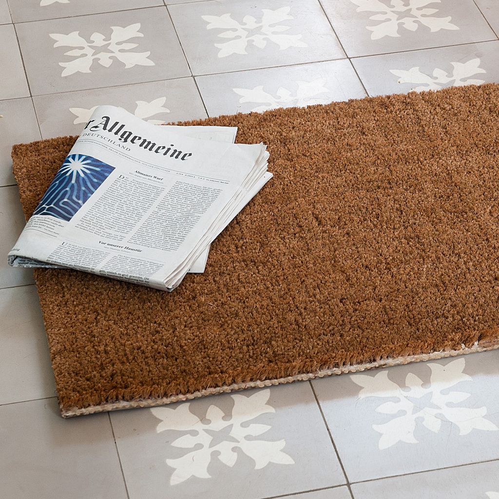 Konsequent aufgeschobene Modernisierungen haben der Firma August Schär, der einzigen Kokosweberei Deutschlands, einen ganzen Park alter Webmaschinen erhalten, die in der Lage sind, aus Kokosfasern Garne und Gewebe von einzigartiger Robustheit und enormer Langlebigkeit zu produzieren. Die Matten stellen eine ausgezeichnete Barriere gegen Straßenschmutz dar und sind sehr feuchtigkeitsbeständig, sollten aber nicht im Wasser oder an Stellen liegen, an denen sie direktem Regeneinfall ausgesetzt sind. Florhöhe ca. 25 mm. 100 % Kokos.