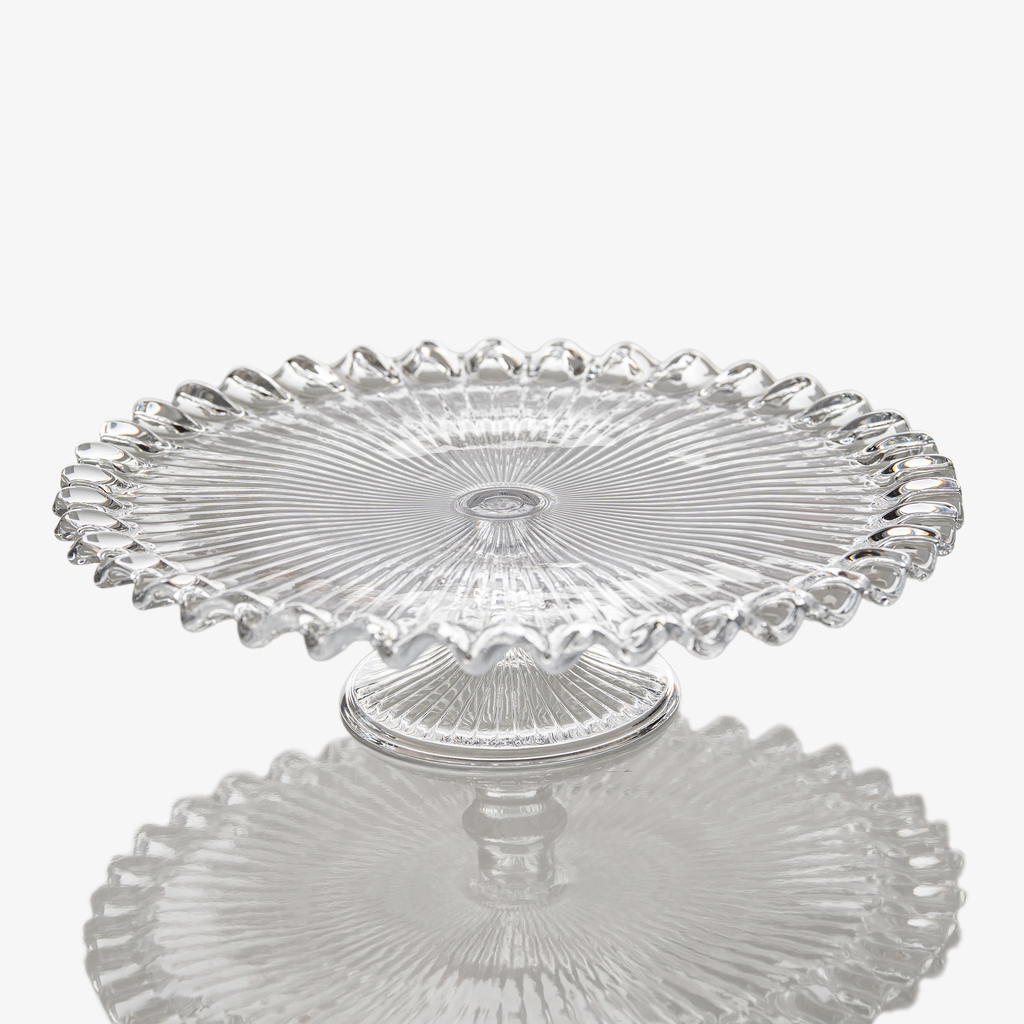 Den besonderen Charakter dieser Kuchenplatte prägt ihr gewellter Rand. Getragen wird sie von einem breiten, strahlenförmig kannelierten Fuß, der für einen sicheren Stand sorgt und die klassische Anmutung unterstreicht. Gefertigt aus robustem Glas, bietet sie die ideale Bühne, um kleine Kuchen, Torten und Tartes zu präsentieren. Spülmaschinenfest.